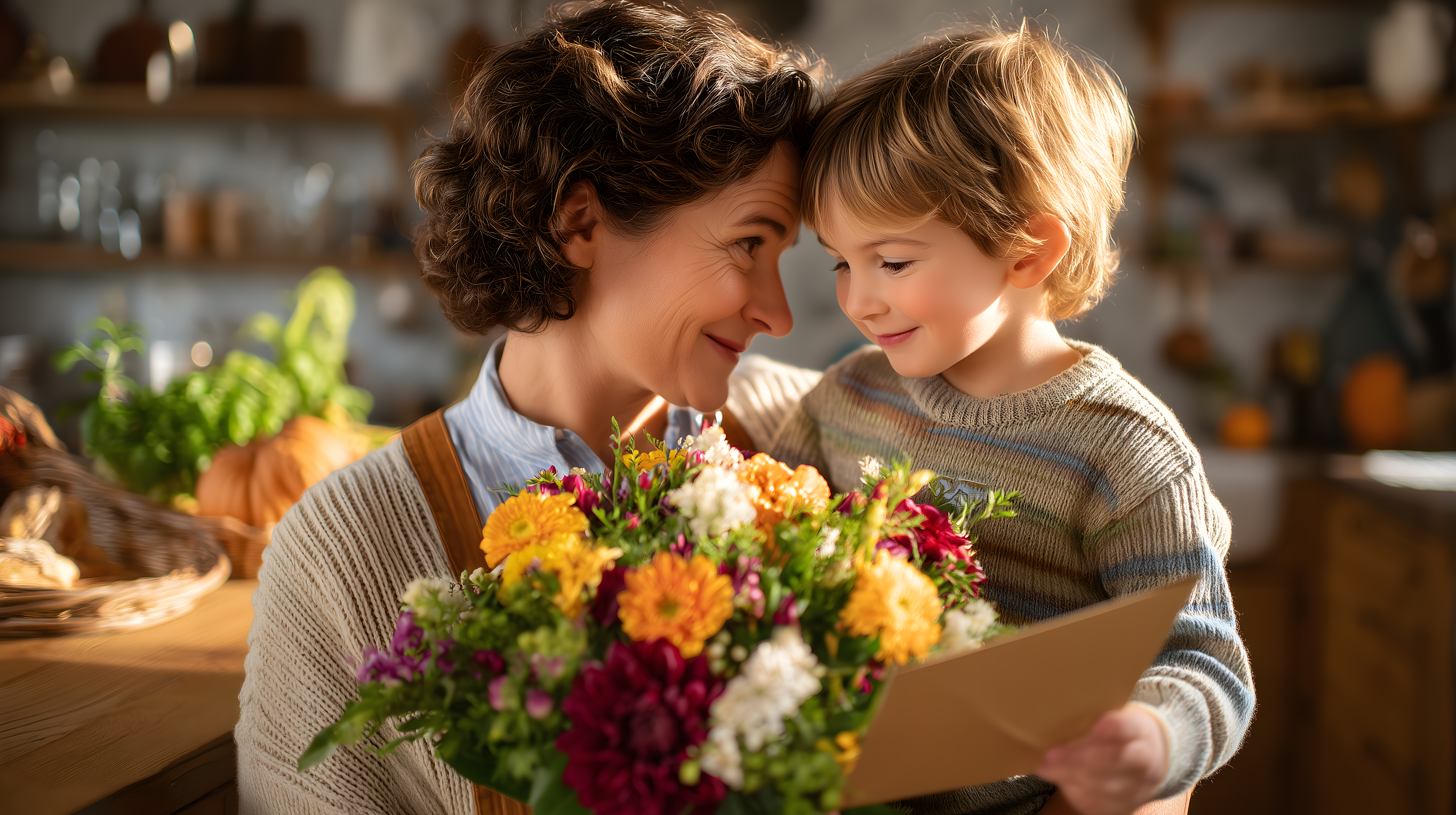 Dieses warme und stimmungsvolle Bild zeigt eine Mutter, die gemeinsam mit ihrem kleinen Sohn einen bunten Blumenstrauss hält. Die Szene spielt in einer rustikalen Küche, die einen gemütlichen und einladenden Eindruck vermittelt. Mutter und Kind lächeln einander glücklich an, was die liebevolle Beziehung zwischen ihnen deutlich zum Ausdruck bringt. Das Foto eignet sich hervorragend für den Einsatz in Artikeln, Werbekampagnen oder sozialen Medien rund um die Themen Muttertag, Familienliebe und Fürsorge. Mit seiner hohen Auflösung und den Creative-Commons-Nutzungsrechten ist dieses kostenlose Stockfoto eine wertvolle Ressource für verschiedenste visuelle Projekte.