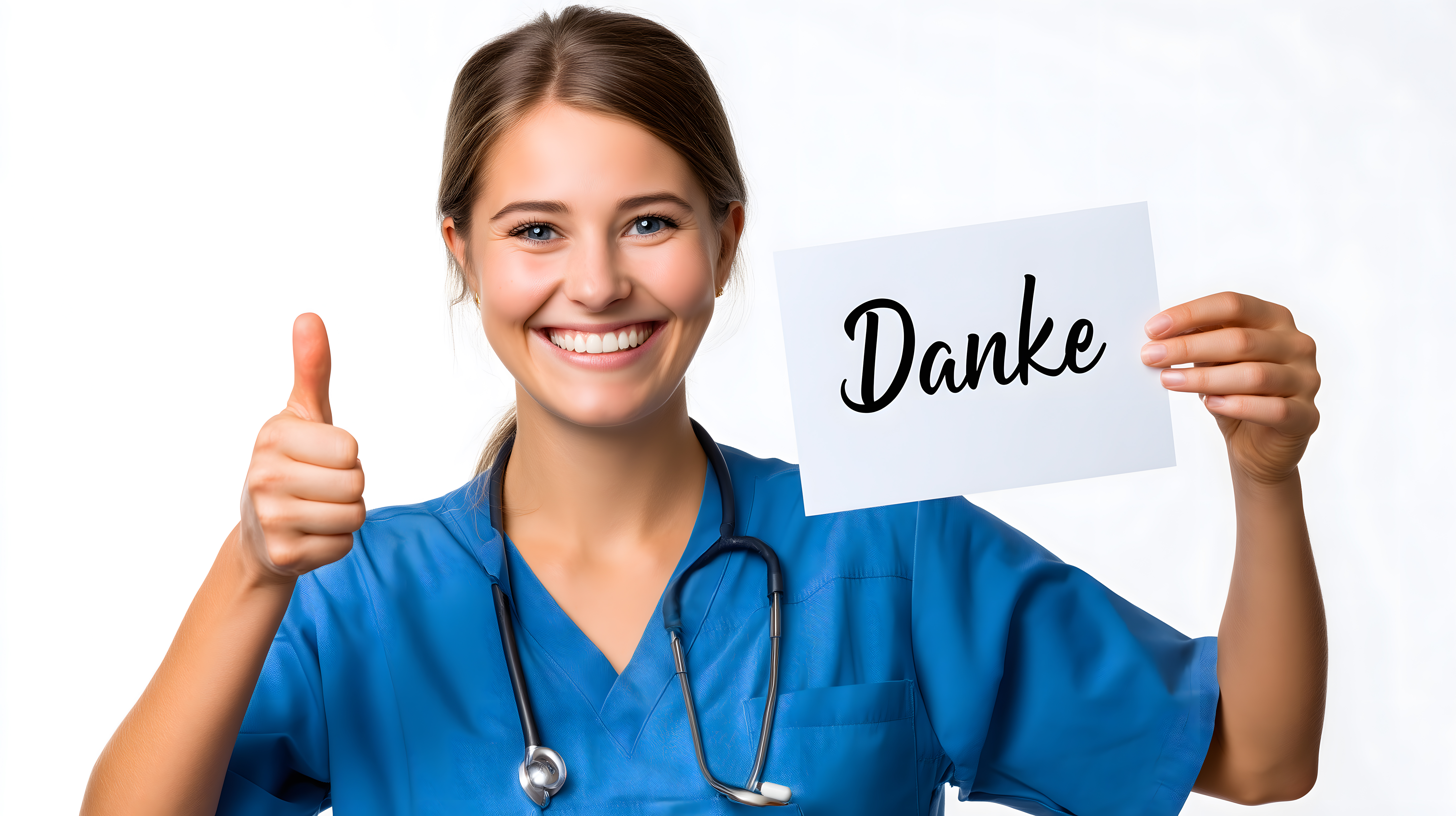 Dieses Stockfoto zeigt eine lächelnde Medizinfachkraft in einem blauen OP-Kittel, die eine Tafel mit der Aufschrift 'Danke' in die Kamera hält. Die Frau blickt freundlich in die Kamera und gibt mit ihrer anderen Hand ein Daumen-hoch-Zeichen. Das Foto ist in einem Studiostil aufgenommen, mit einem weißen Hintergrund, der den Fokus auf die Person lenkt. Dieses Bild eignet sich hervorragend für den Einsatz in Artikeln, Blogbeiträgen oder Social-Media-Posts, die sich mit Dankbarkeit, Gesundheitswesen oder medizinischen Berufen beschäftigen. Es ist ein kostenloses Stockfoto in hoher Auflösung, lizenziert unter Creative Commons.