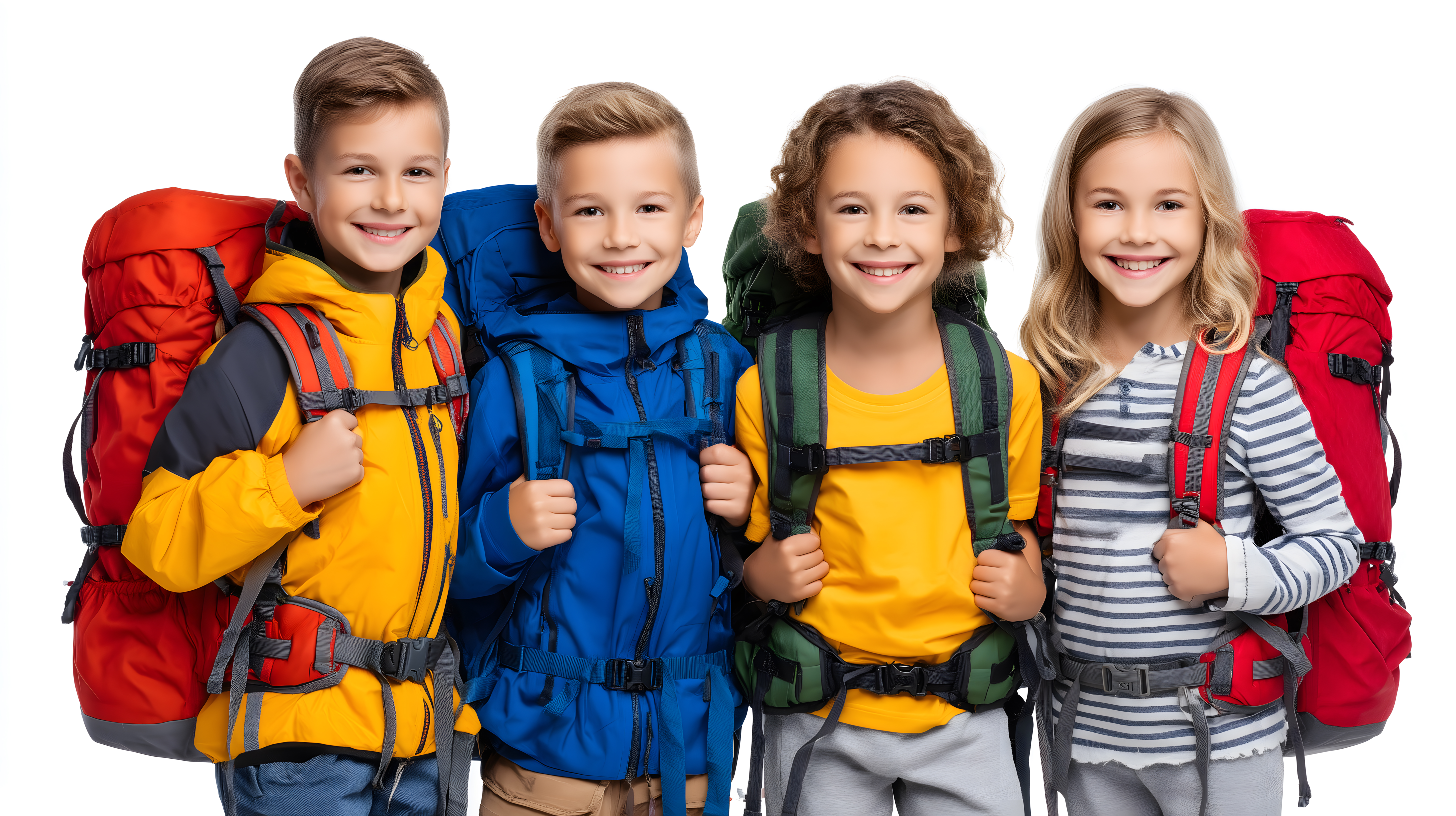 Das Bild zeigt eine Gruppe von vier fröhlichen Kindern, die bereit für ein Outdoor-Abenteuer sind. Die Kinder, zwei Jungen und zwei Mädchen, tragen bunte Jacken, Hosen und Rucksäcke in kräftigen Farben wie Rot, Blau, Gelb und Grün. Sie lächeln in die Kamera und vermitteln eine positive, abenteuerlustige Stimmung.