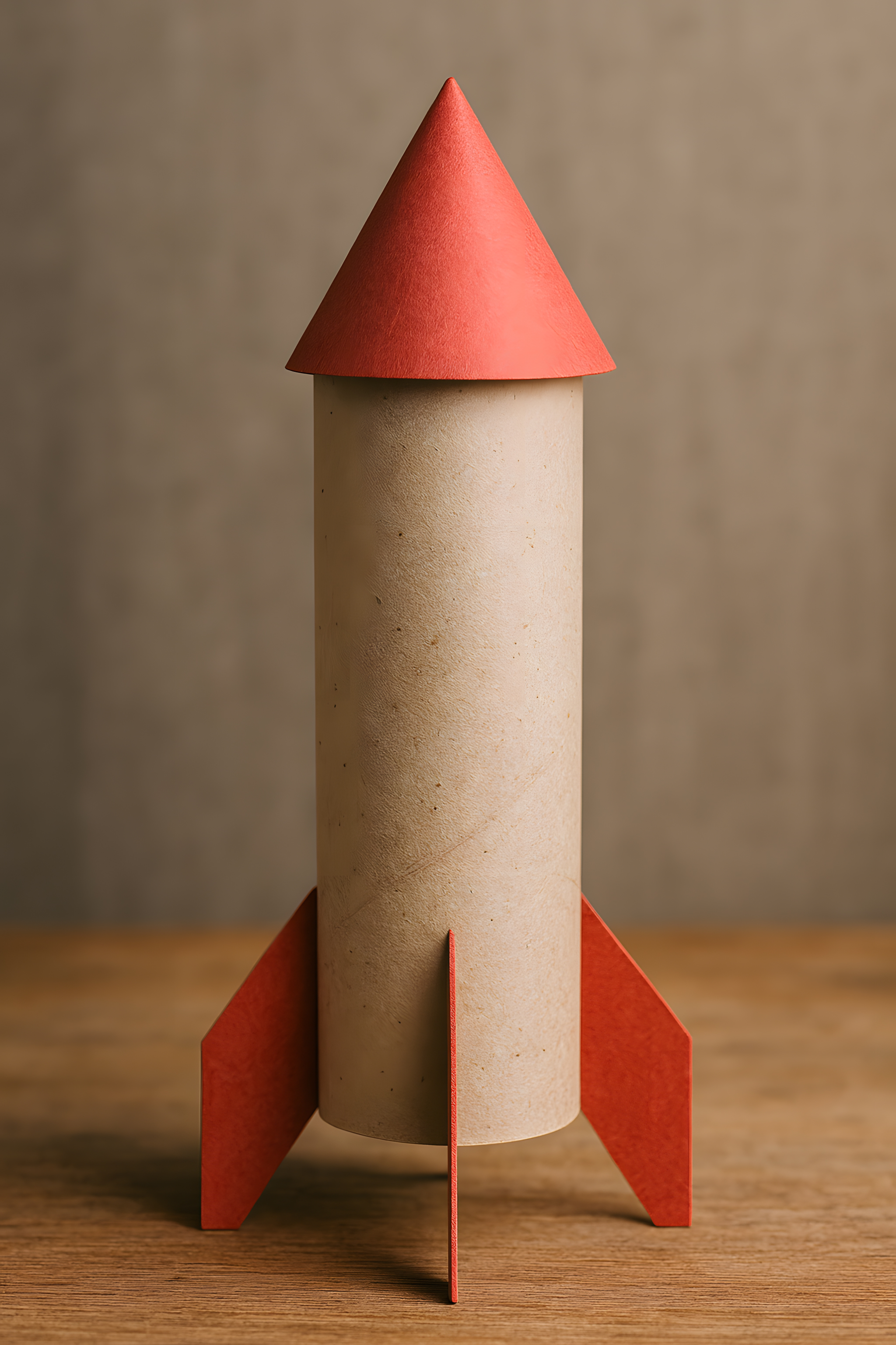 Dieses Foto zeigt eine einfache DIY-Rakete, die aus einer Papprolle und rotem Papier gefertigt wurde. Die Rakete steht auf einem Holztisch vor einer grauen Wand. Das Bild hat einen minimalistischen und geometrischen Stil mit klaren Formen und Linien. Diese selbstgebaute Rakete eignet sich hervorragend als Deko-Objekt für den Arbeitsplatz, das Kinderzimmer oder als Inspiration für kreative Bastel-Projekte. Als kostenloses Stockfoto in hoher Auflösung unter Creative-Commons-Lizenz kann es vielseitig in Blogs, Newslettern oder auf Social-Media-Kanälen eingesetzt werden.