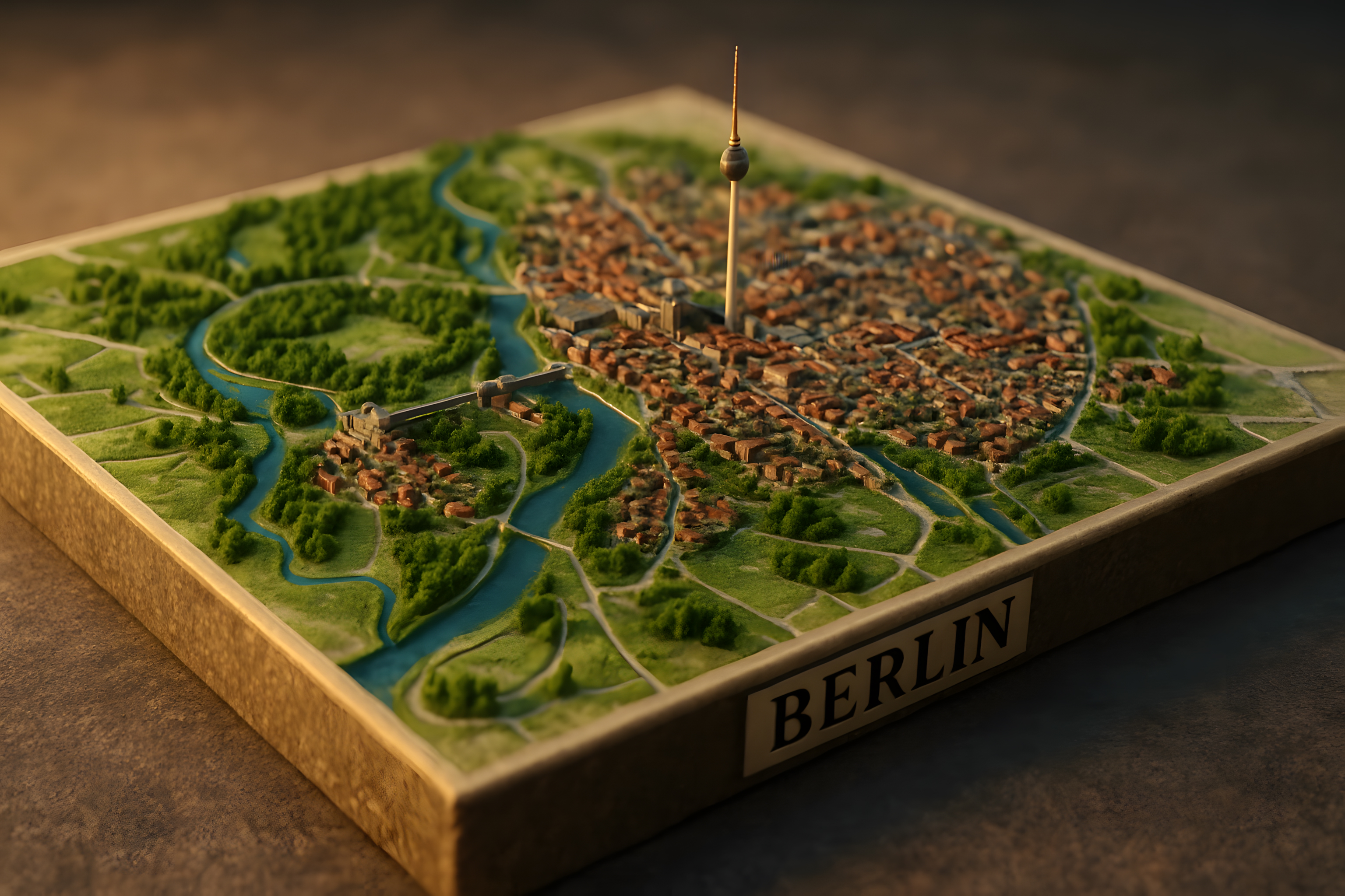 Dieses plastische 3D-Modell zeigt die Skyline der deutschen Hauptstadt Berlin aus einer erhöhten Perspektive. Die detaillierten Gebäude und Strukturen sind in einem braunen, erdigen Farbton gehalten, während die Grünflächen und der Flussverlauf der Spree in kräftigen Grüntönen hervorstechen. Der markante Berliner Fernsehturm ragt als Wahrzeichen der Stadt aus der Miniaturlandschaft heraus. Das hochauflösende Stockfoto ist in hoher Qualität und unter einer Creative-Commons-Lizenz frei nutzbar, zum Beispiel für Reiseblogbeiträge, Stadtführungen oder Präsentationen zur Stadtplanung und Architektur.