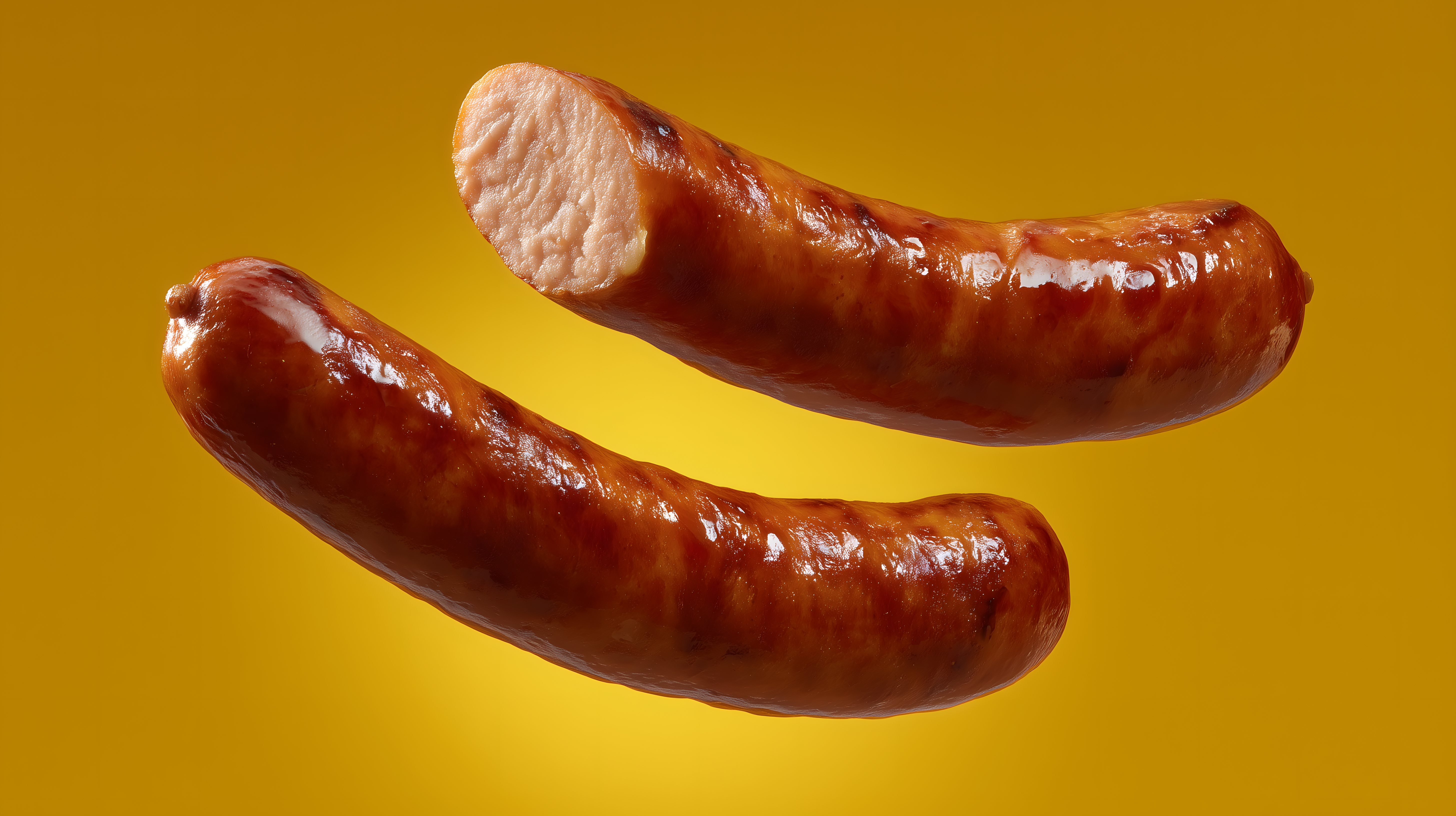 Das Bild zeigt zwei saftige, glänzende Bratwürste auf einem kräftigen, gelben Hintergrund. Die Würste sind sorgfältig platziert, sodass ihre dunkle, knusprige Oberfläche und rötliche Färbung deutlich hervortreten. Die hochwertige Aufnahme mit scharfer Fokussierung lässt die Textur und Details der Würste klar erkennen und weckt Appetit auf ein leckeres Grillvergnügen.