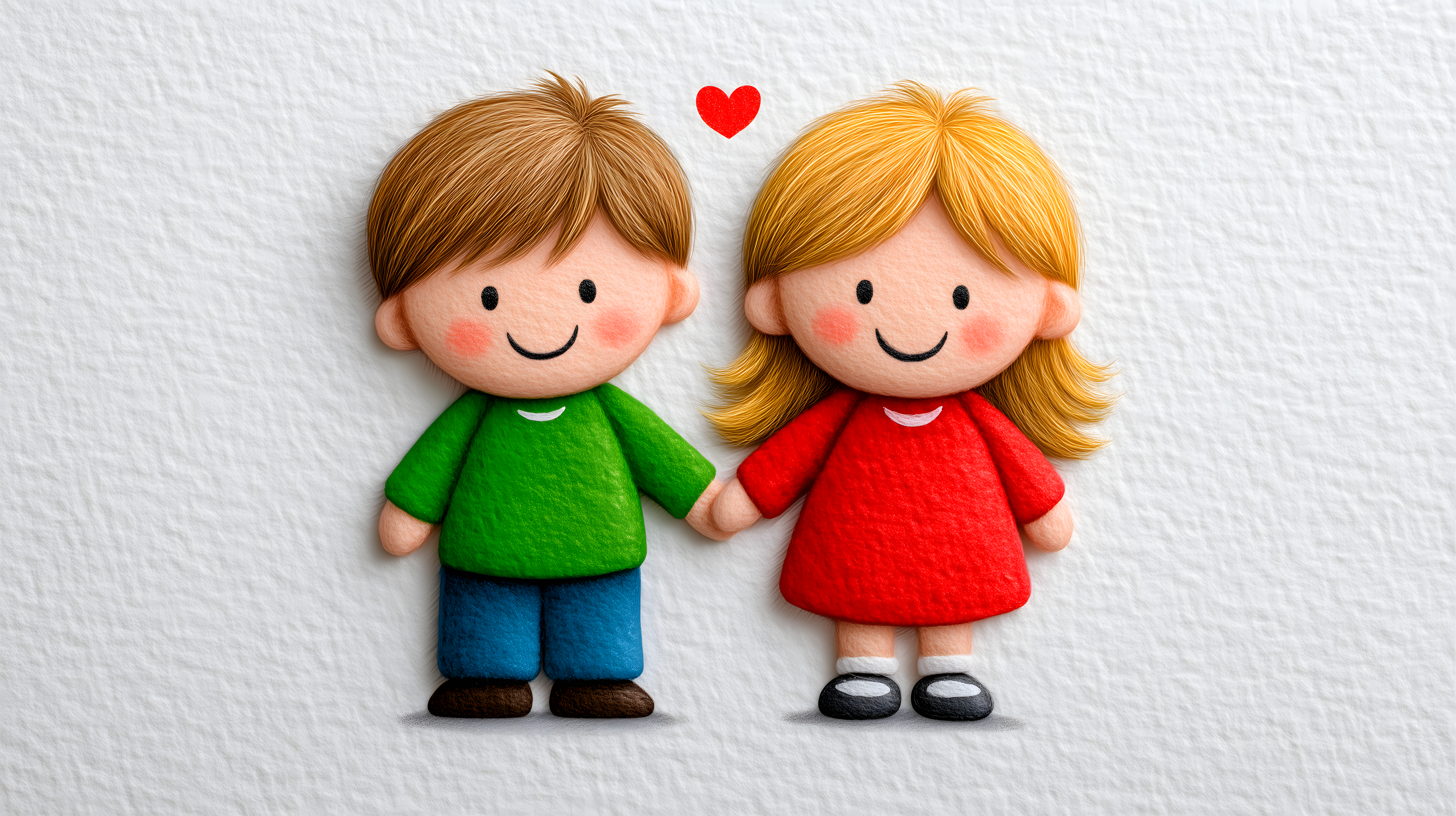 Dieses charmante Cartoon-Bild zeigt ein kleines Mädchen und einen Jungen, die sich liebevoll an den Händen halten. Sie tragen farbenfrohe, einfache Kleidung und lächeln glücklich. Ein rotes Herz schwebt zwischen den beiden, was die Szene sehr romantisch und gefühlvoll erscheinen lässt. Die Illustration ist in einem freundlichen, verspielten Stil gehalten und eignet sich hervorragend als kostenloses Stockfoto für Blogs, Newsletter, Social Media und Werbung in hoher Auflösung und unter Creative-Commons-Lizenz.