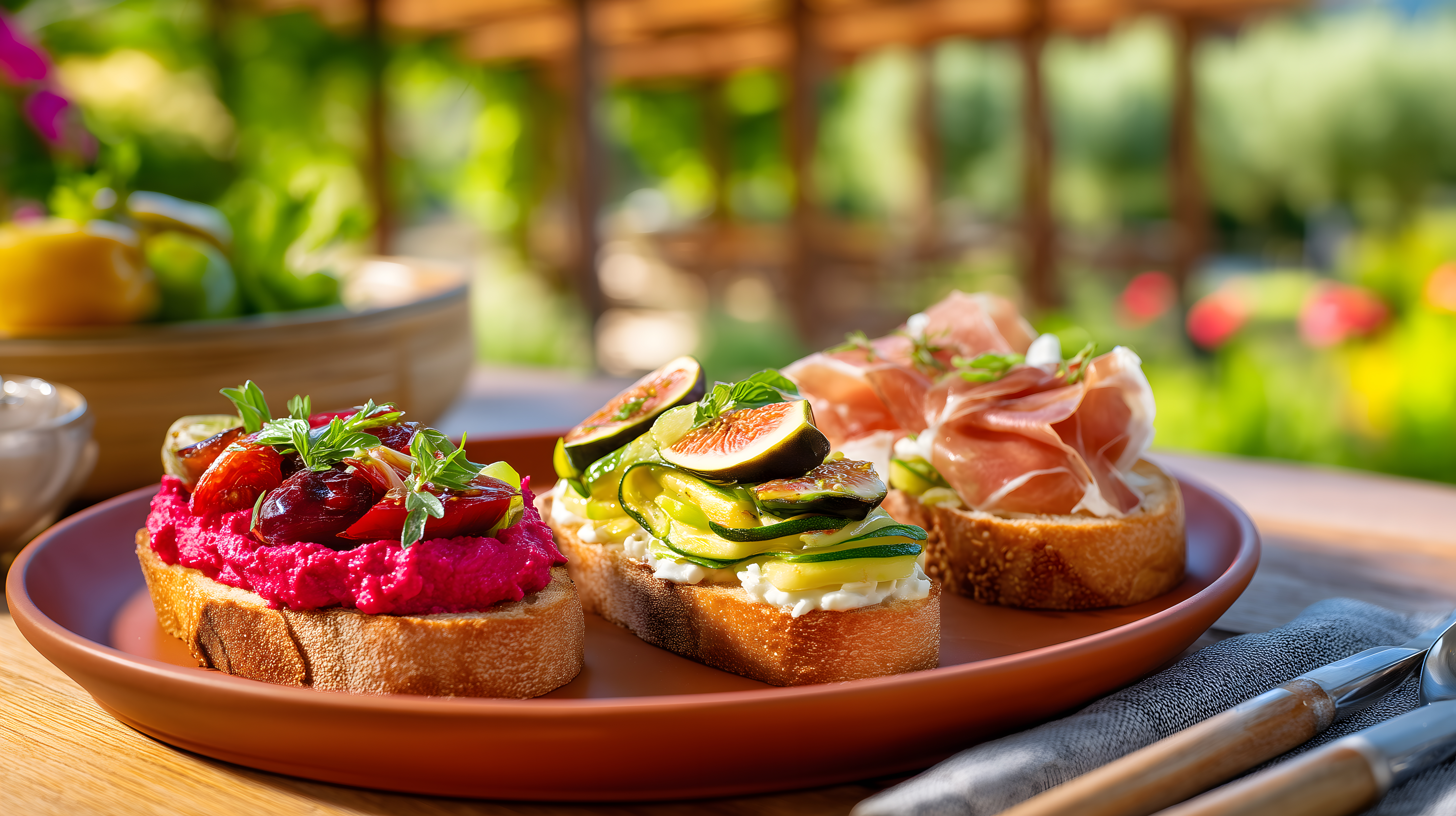 Dieses Foto zeigt eine Auswahl an köstlichen Bruschetta-Häppchen, die auf einem rustikalen Holzteller angerichtet sind. Die Bruschetta sind mit verschiedenen frischen Zutaten belegt, wie leckeren Tomaten, Zucchini, Feigen und Schinken. Die mediterranen Farben und das natürliche Ambiente mit Blättern und Zweigen im Hintergrund verleihen dem Bild eine einladende und sommerliche Atmosphäre. Das Foto eignet sich perfekt als kostenloses Hintergrundbild oder Stockfoto für Blogs, Social-Media-Beiträge, Werbung und mehr - es ist in hoher Auflösung und unter Creative-Commons-Lizenz verfügbar.
