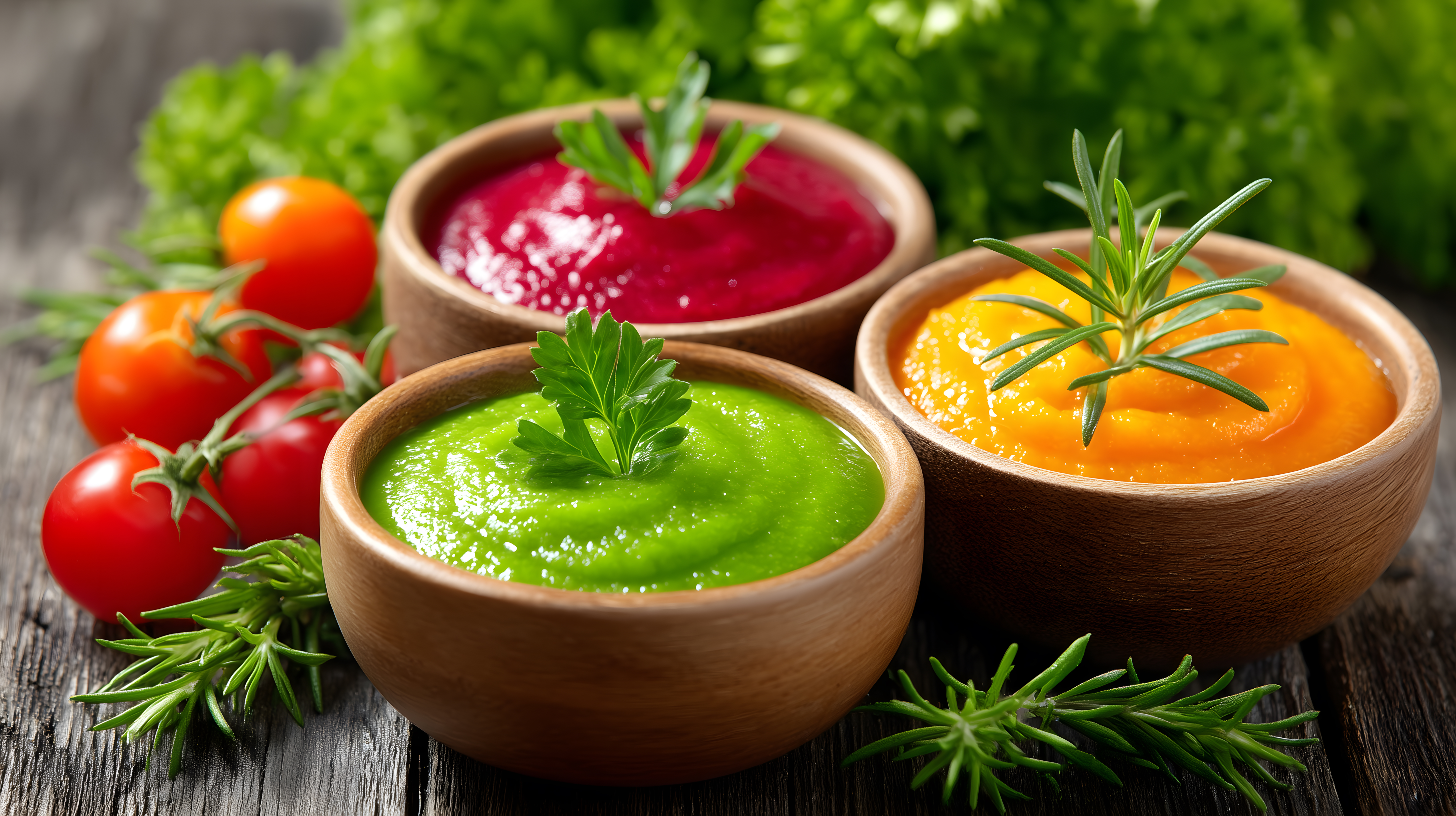 Dieses Foto zeigt drei köstliche Gemüsecremes in rustikalen Holzschalen, umgeben von frischen Kräutern und bunten Tomaten. Die Cremes in kräftigen Grün-, Rot- und Orangetönen präsentieren sich einladend und lassen auf einen leckeren, gesunden Genuss schließen. Das Bild eignet sich ideal für den Einsatz in Rezept-Blogs, Kochbüchern, auf Ernährungsportalen oder in Werbematerialien für gesunde Ernährung. Als hochauflösendes, kostenloses Stockfoto unter Creative-Commons-Lizenz können Kreativschaffende das Bild für vielfältige Zwecke wie Social-Media-Posts, Newsletter-Designs oder Werbeanzeigen verwenden.