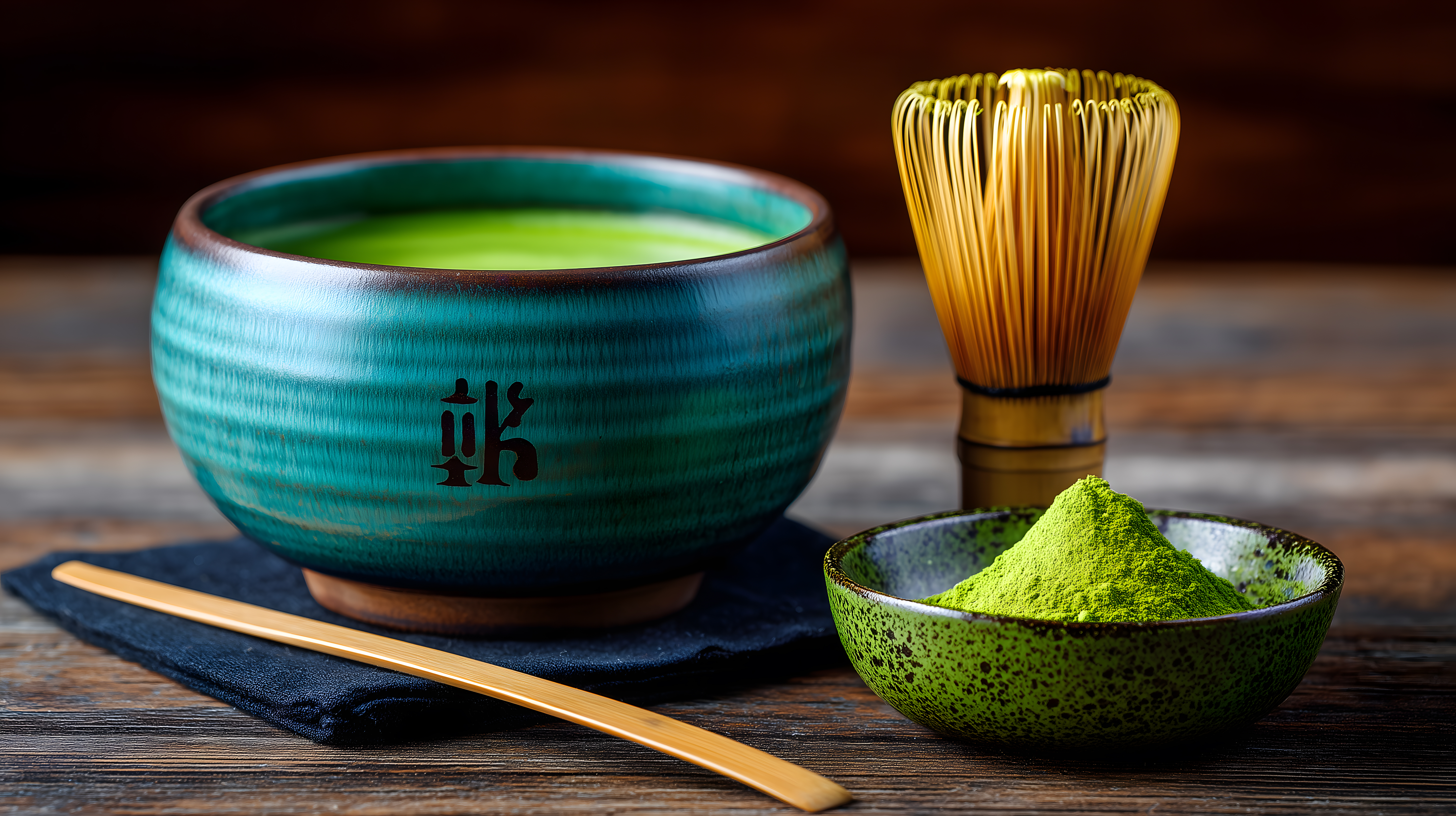 Dieses Foto zeigt eine traditionelle Zubereitung von Matcha-Tee. Im Mittelpunkt steht eine tiefgrüne, keramische Teeschale, in der sich das pulvrige, grüne Matcha-Pulver befindet. Daneben liegt ein Bambusstab (Chasen), der zum Aufschäumen des Tees verwendet wird. Das Arrangement ist vor einem dunklen Holzhintergrund platziert, was dem Bild eine rustikale und natürliche Ausstrahlung verleiht. Das Foto eignet sich hervorragend als Stockfoto für Beiträge rund um Teekultur, Gesundheit, Wellness oder japanische Kulinarik. Das hochwertige Bild in hoher Auflösung steht unter der Creative-Commons-Lizenz zur kostenlosen Nutzung bereit.