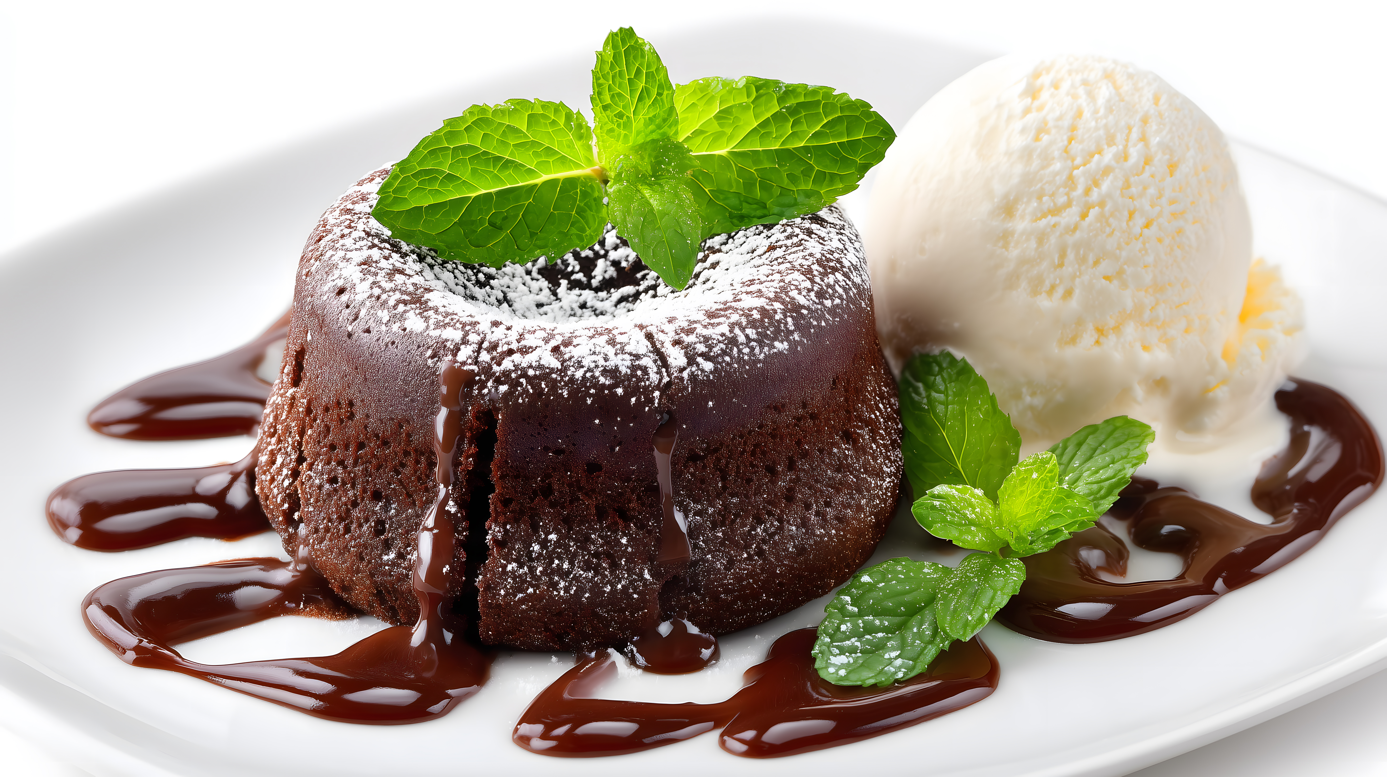 Das Bild zeigt einen köstlichen Schokoladen-Lava-Kuchen, der frisch aus dem Ofen kommt und mit flüssiger Schokoladensoße übergossen ist. Dazu wurde eine Kugel cremiges Vanilleeis auf dem Teller platziert, umrahmt von frischen Minzblättern. Die Komposition in hellen und dunklen Farbtönen sowie die sorgfältige Anrichtung verleihen dem Dessert einen eleganten, einladenden Charakter. Dieses hochwertige Stockfoto eignet sich perfekt für die Verwendung in Rezeptbüchern, Menükarten, Kochblog-Artikeln oder zur Bewerbung exklusiver Catering-Angebote. Das Foto ist in hoher Auflösung und unter einer Creative-Commons-Lizenz frei verfügbar.
