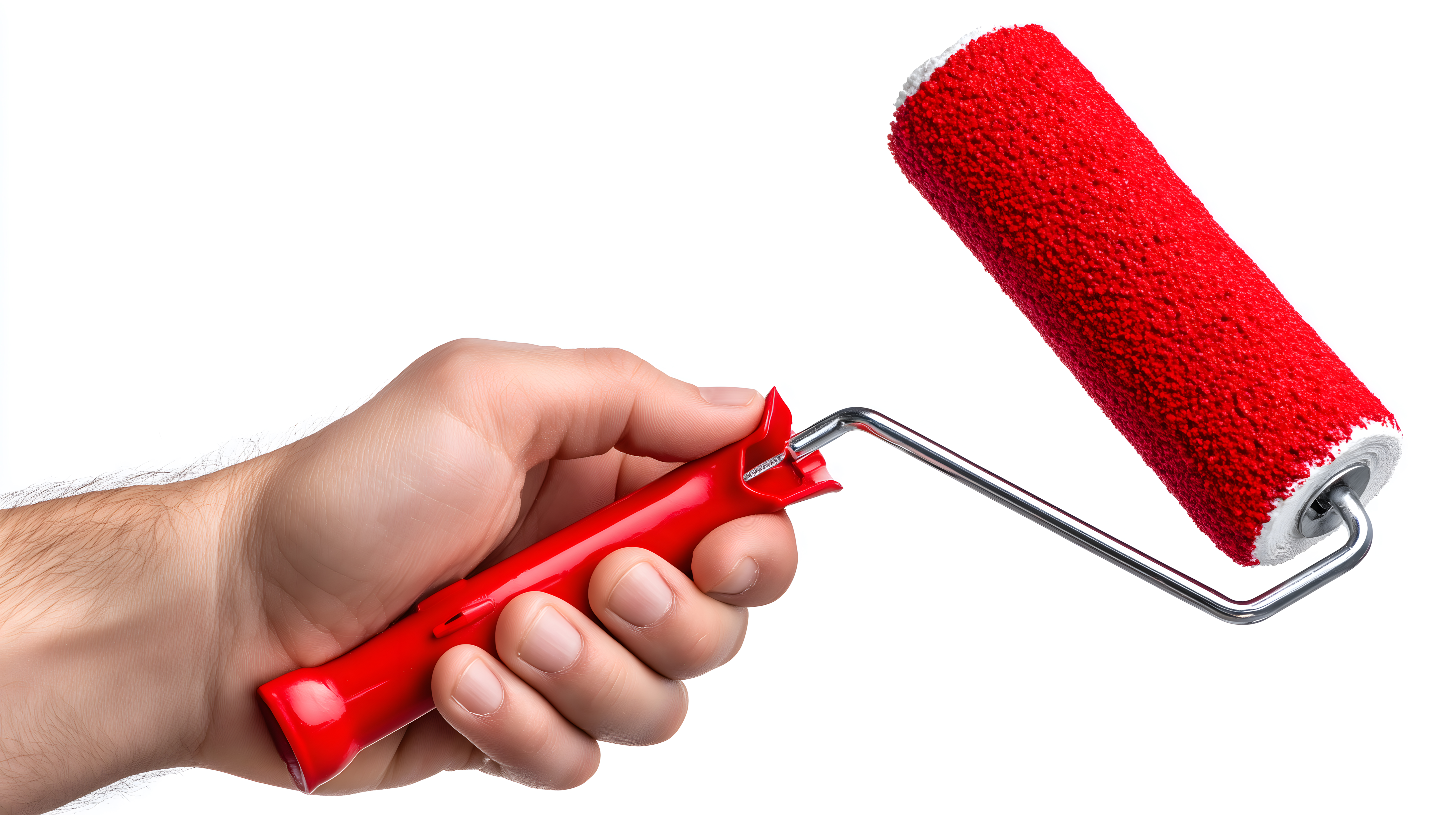 Das Bild zeigt eine rote Farbwalze, die in einer Hand gehalten wird. Der Farbroller hat einen kräftig roten Bezug und einen metallischen Griff, der von Finger umfasst wird. Der Hintergrund ist weiß, wodurch der Fokus ganz auf das Werkzeug gelenkt wird. Dieses Stockfoto eignet sich hervorragend für Beiträge rund um Renovierung, Innenausbau, Heimwerken oder Malerbedarf. Es ist in hoher Auflösung verfügbar und unter einer Creative-Commons-Lizenz kostenfrei nutzbar.