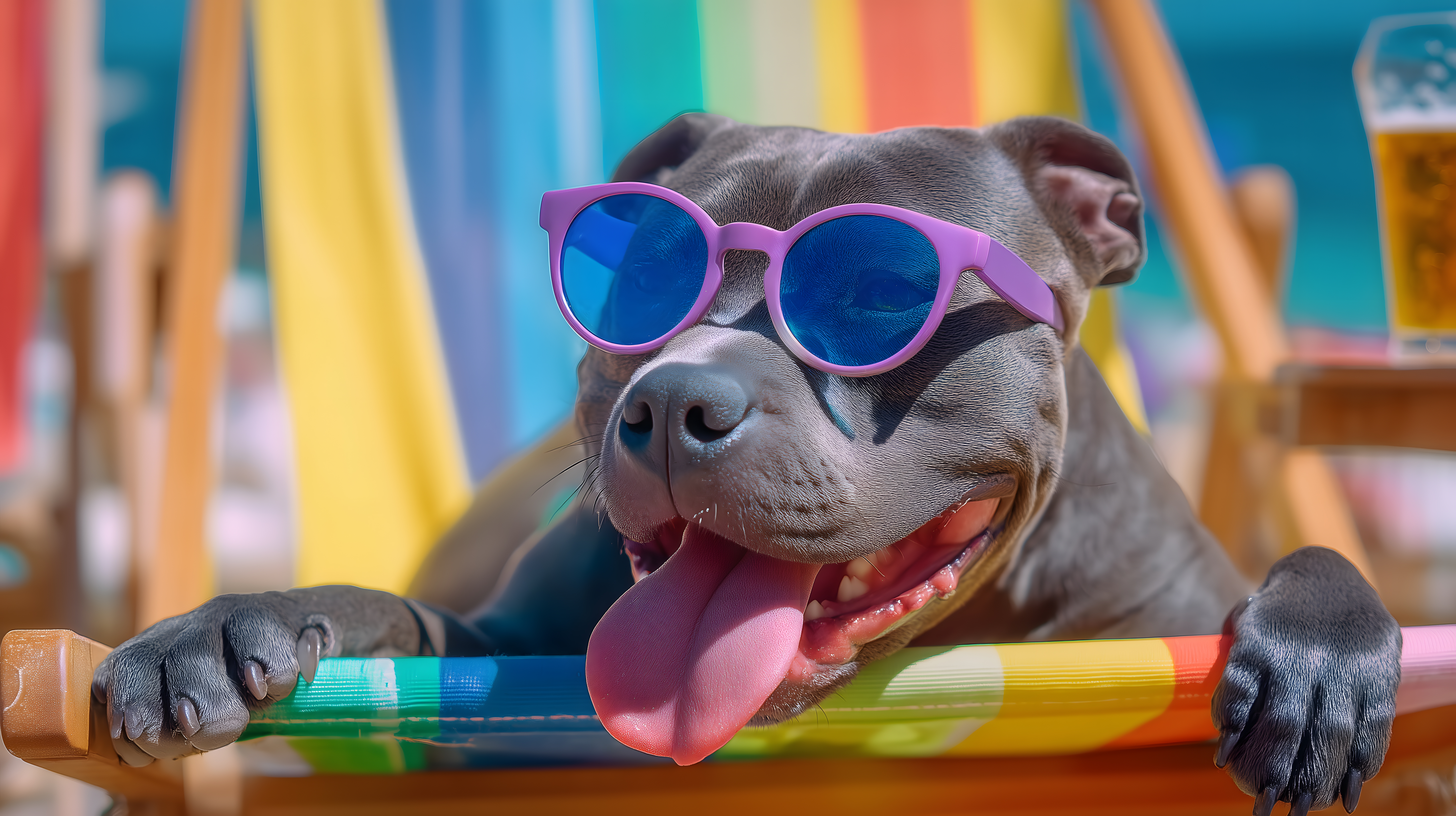 Das Foto zeigt einen äußerst fröhlichen und entspannten Pitbull-Hund, der eine bunte Sonnenbrille trägt und auf einer bunten Strandliege am Strand sitzt. Der Hund streckt seine Zunge heraus und scheint das Strandleben in vollen Zügen zu genießen. Der Hintergrund ist voller bunter Farben und Streifen, die eine heitere und sommerliche Stimmung vermitteln. Dieses Stockfoto in hoher Auflösung ist perfekt geeignet für den Einsatz in Blogs, Newslettern, Social-Media-Beiträgen oder Werbematerialien rund um das Thema Urlaub, Strand und Tiere. Es steht unter einer Creative-Commons-Lizenz zur freien Verwendung zur Verfügung.