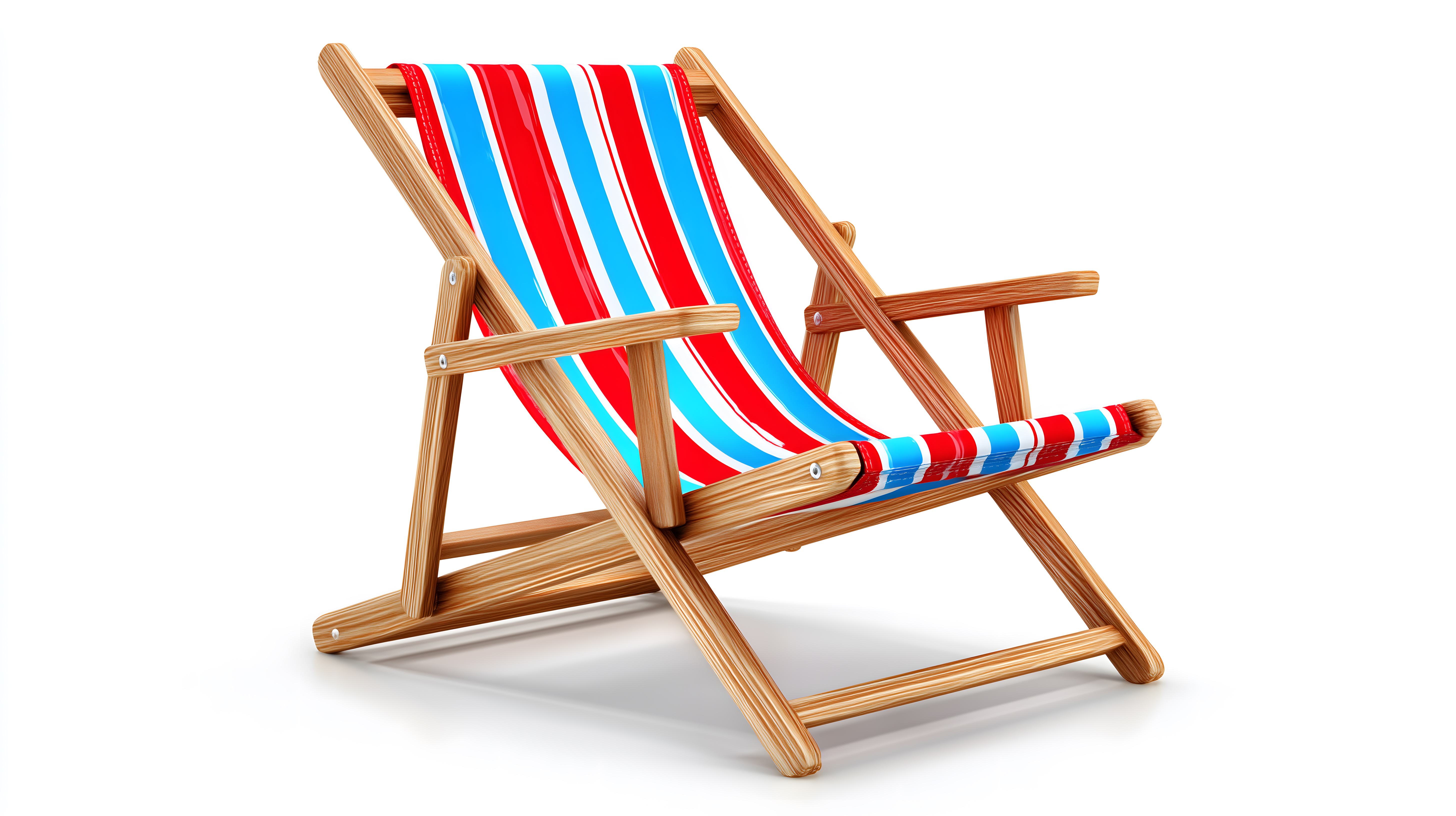 Das Bild zeigt einen hölzernen, gestreiften Strandstuhl vor einem weißen Hintergrund. Der Stuhl hat ein klassisches Design mit einem roten, blauen und weißen vertikalen Streifenmuster auf der Sitzfläche und Rückenlehne. Er ist aus Holz gefertigt und bietet einen einladenden Platz zum Relaxen und Entspannen. Das Foto eignet sich hervorragend als Stockfoto für den Einsatz in Blogs, Newslettern, Social-Media-Posts oder Werbekampagnen rund um Themen wie Sommerurlaub, Freizeitaktivitäten, Möbel oder Outdoor-Lebensfreude. Das hochauflösende Bild steht unter der Creative-Commons-Lizenz kostenlos zur Verfügung.