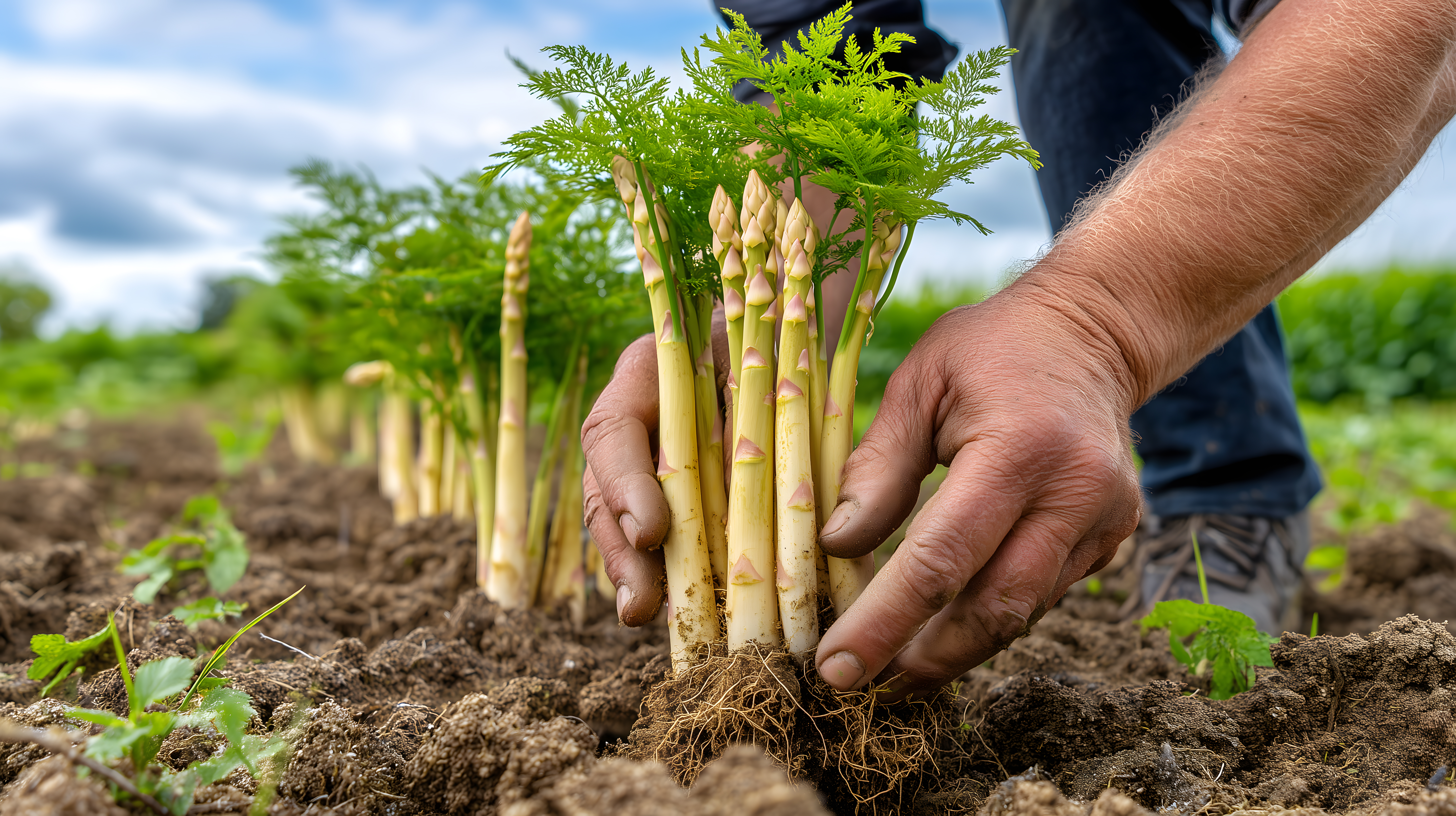 Das Foto zeigt frischen, weißen Spargel, der direkt vom Feld geerntet wird. Die langen, gerade Stangen werden sorgfältig mit den Händen aus dem Boden gezogen, umgeben von grünen Blättern und Farnkräutern. Die Szene vermittelt eine natürliche, ländliche Atmosphäre und die Frische der Ernte. Dieses hochauflösende Stockfoto eignet sich perfekt für Blogbeiträge, Newsletter, Social-Media-Posts oder Werbematerial rund um gesunde, nachhaltige Ernährung, Landwirtschaft und Gartenbau. Das Foto steht unter der Creative-Commons-Lizenz zur freien Nutzung zur Verfügung.