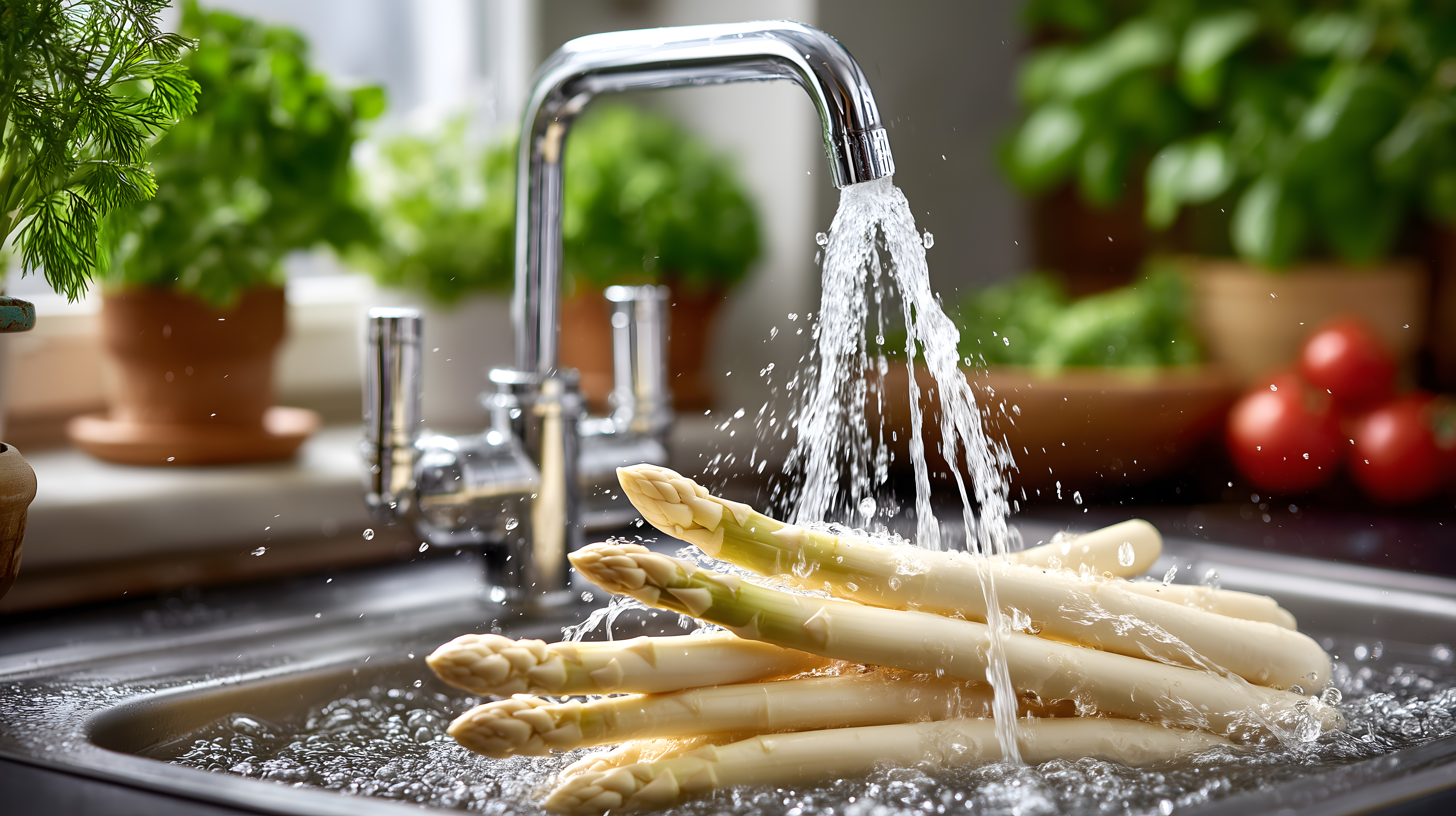 Dieses Foto zeigt frischen, weißen Spargel, der unter einem Wasserhahn gespült wird. Der Spargel liegt auf einem dunklen Küchenarbeitsbereich, umgeben von grünen Kräutern und anderen Gemüsezutaten. Das Wasser sprudelt über den Spargel, der von zahlreichen Wassertropfen bedeckt ist. Das Bild vermittelt einen natürlichen, frischen und gesunden Eindruck der Zubereitung von Lebensmitteln in der Küche. Es eignet sich hervorragend als kostenloses Stockfoto für Beiträge zu Themen wie Kochen, Ernährung, gesunde Lebensweise oder nachhaltige Zutaten. Die hohe Auflösung und Creative-Commons-Lizenzierung machen das Bild zu einer wertvollen Ressource für Blogger, Werbekampagnen und Social-Media-Inhalte.