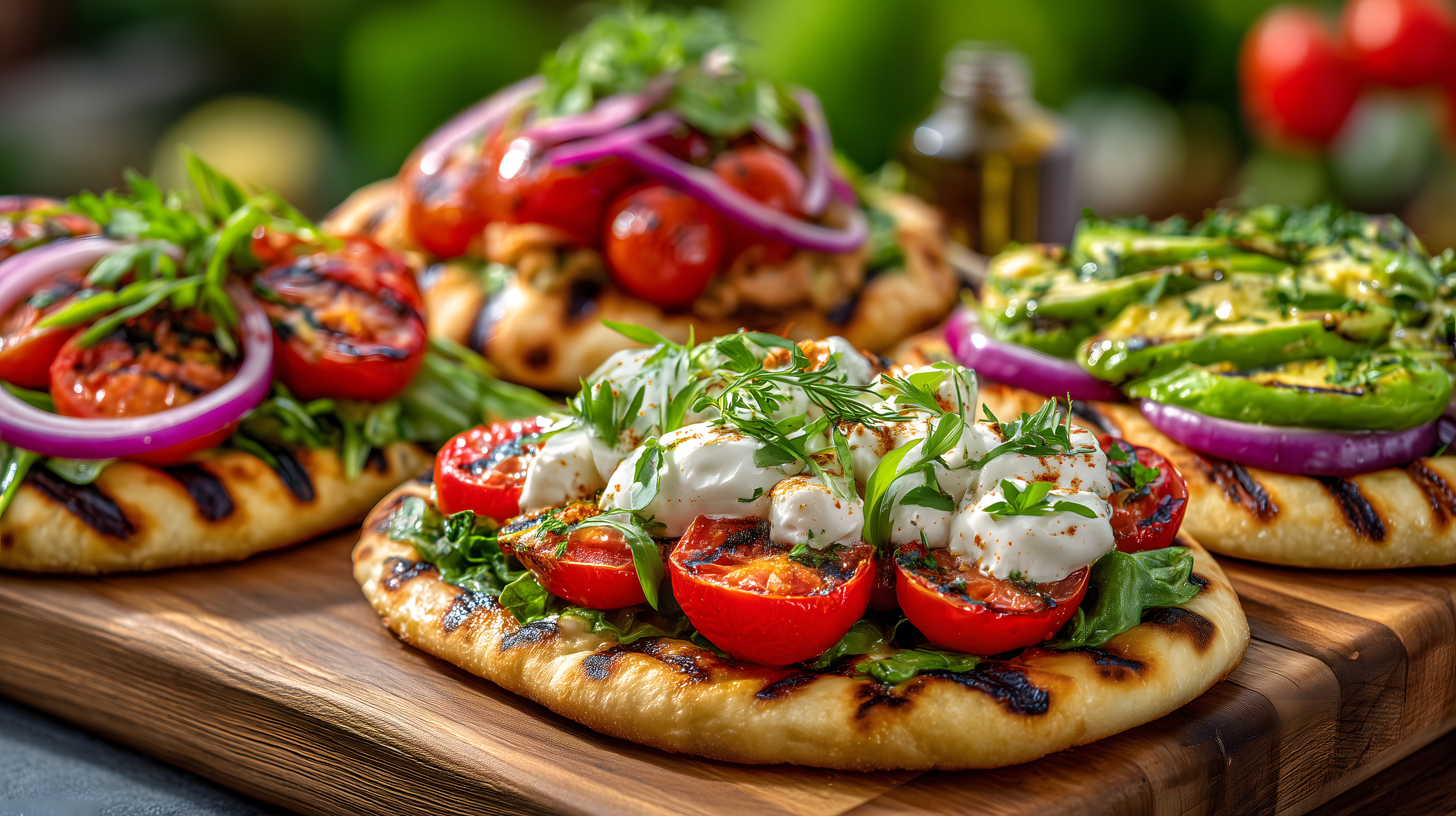 Dieses appetitlich angerichtete Foto zeigt einen mediterranen Fladenbrot-Snack mit frischen Tomaten, Mozzarella und knackigen Kräutern. Die Zutaten sind auf einem rustikalen Holzbrett angerichtet, was der Szene eine natürliche und ländliche Optik verleiht. Die kräftigen Farben, das sorgfältige Food-Styling und die professionelle Fotografie machen das Bild zu einem idealen Begleiter für Blogs, Social-Media-Kanäle oder Werbekampagnen rund um gesunde, leckere Ernährung. Als kostenloses Stockfoto in hoher Auflösung und unter Creative-Commons-Lizenz ist es vielfältig einsetzbar.