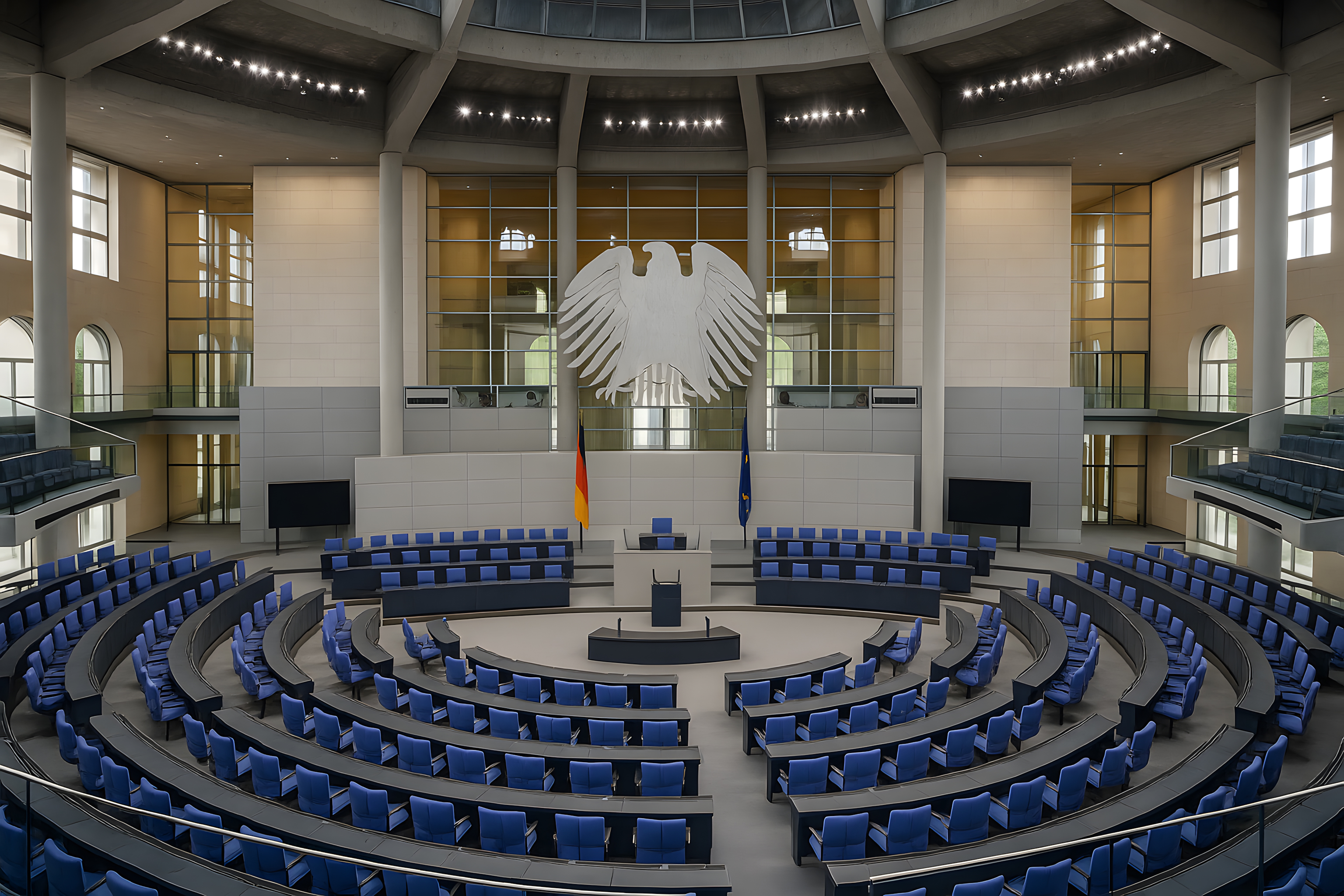 Das Bild zeigt den leeren Plenarsaal des Deutschen Bundestages in Berlin. Der Raum ist sehr groß und beeindruckend mit seinem hohen Gewölbe, den Glasfenstern und der prächtigen Bundesadler-Statue an der Stirnwand. Die blauen Sitze für die Abgeordneten sind in einem halbkreisförmigen Arrangement angeordnet, während die grauen Wandflächen und Säulen dem Raum eine ernste, aber elegante Atmosphäre verleihen. Dieses Foto eignet sich hervorragend als kostenloses Stockbild für Blogs, Newsletter, Social-Media-Posts oder Werbematerialien im Bereich Politik, Regierung und Architektur. Das hochauflösende Bild ist unter der Creative-Commons-Lizenz frei verwendbar.
