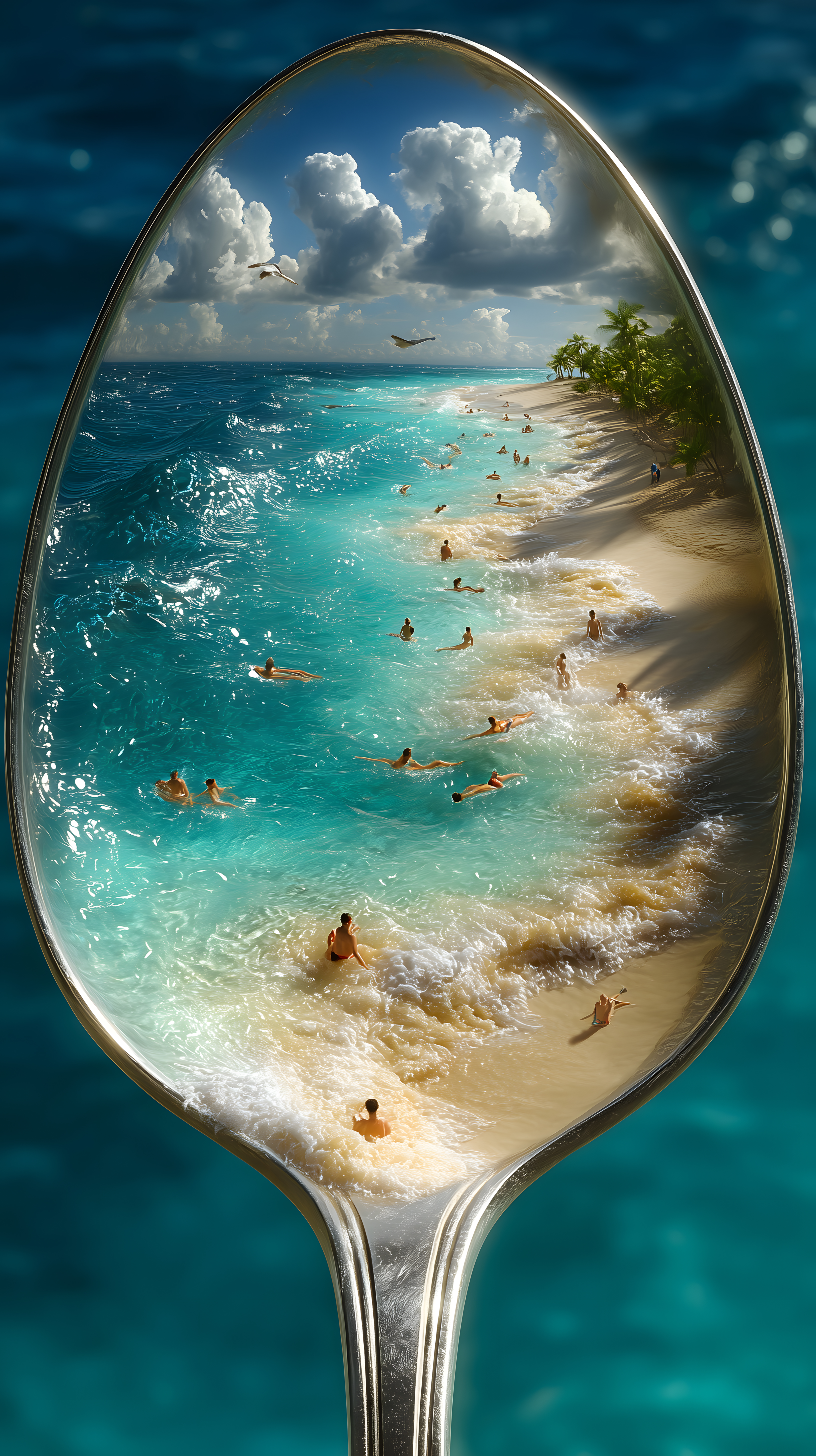 Dieses kreative Konzeptfoto zeigt einen Ausschnitt des türkisblauen Ozeans und eines Sandstrandes in einem silbrigen Löffel. Die detailreiche Darstellung lässt den Betrachter den Eindruck einer idyllischen Urlaubsszene gewinnen. Durch die ungewöhnliche Perspektive und die Spiegelung im Löffel entsteht ein surrealer, minimalistischer Eindruck. Das hochwertige, kostenlose Stockfoto in hoher Auflösung eignet sich hervorragend für Blogs, Newsletter, Social-Media-Beiträge oder Werbematerial rund um Themen wie Reise, Entspannung und Sommerurlaub. Es steht unter einer Creative-Commons-Lizenz zur Verfügung.