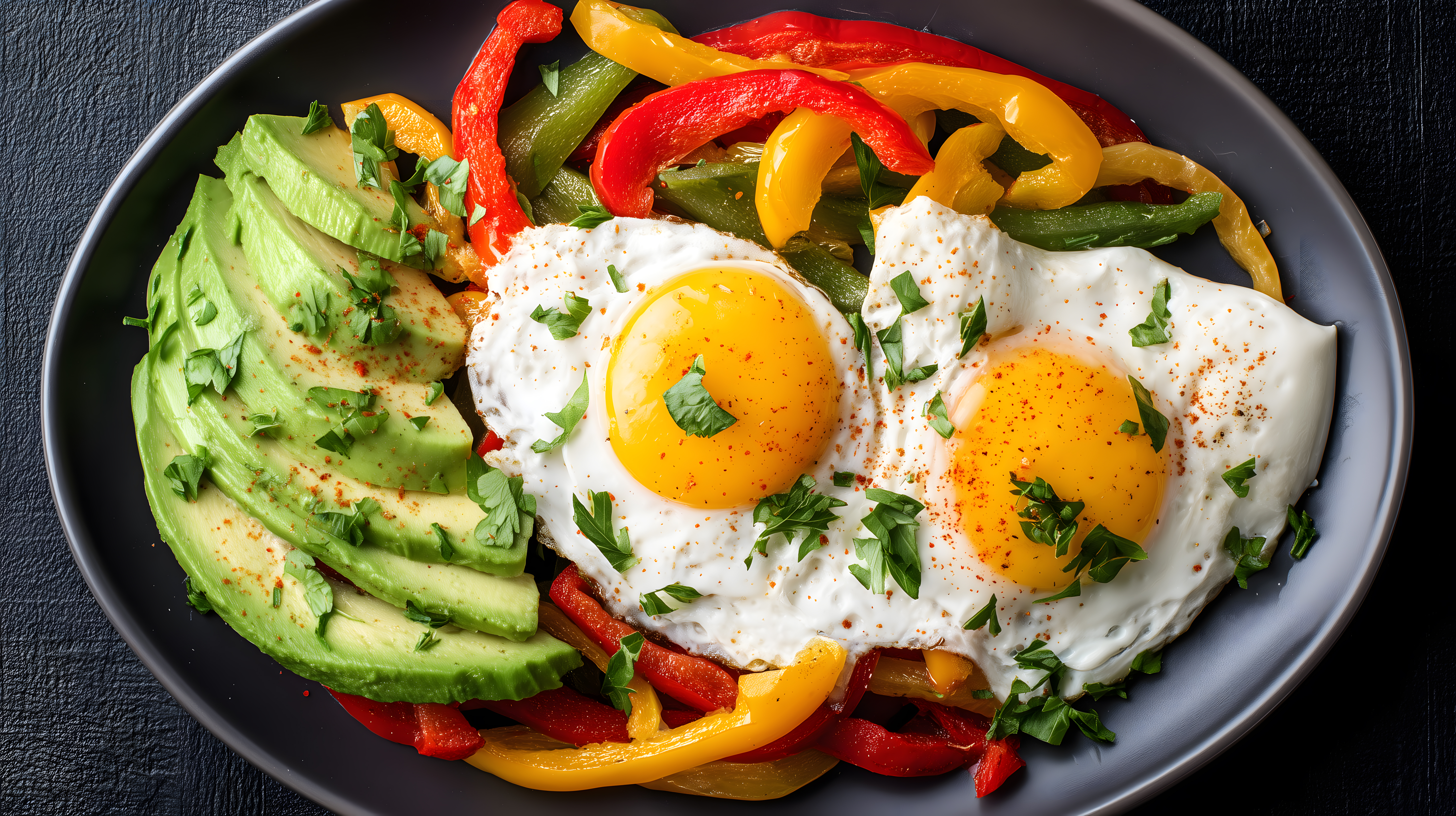 Dieses appetitliche Foto zeigt einen Teller mit einem leckeren, gesunden Gemüseteller. Im Mittelpunkt befinden sich zwei frisch zubereitete Spiegeleier, die von bunten, saftigen Paprikastücken und frischem Salat umgeben sind. Die Avocadostreifen verleihen dem Gericht eine cremige Note und runden die farbenfrohe Komposition perfekt ab. Das Bild eignet sich hervorragend für den Einsatz in Blogs, Newslettern oder Werbekampagnen rund um das Thema Ernährung, gesunde Ernährung oder leckere Mahlzeiten. Dieses hochauflösende Foto steht unter einer Creative-Commons-Lizenz kostenfrei für den Einsatz in Ihren Projekten zur Verfügung.