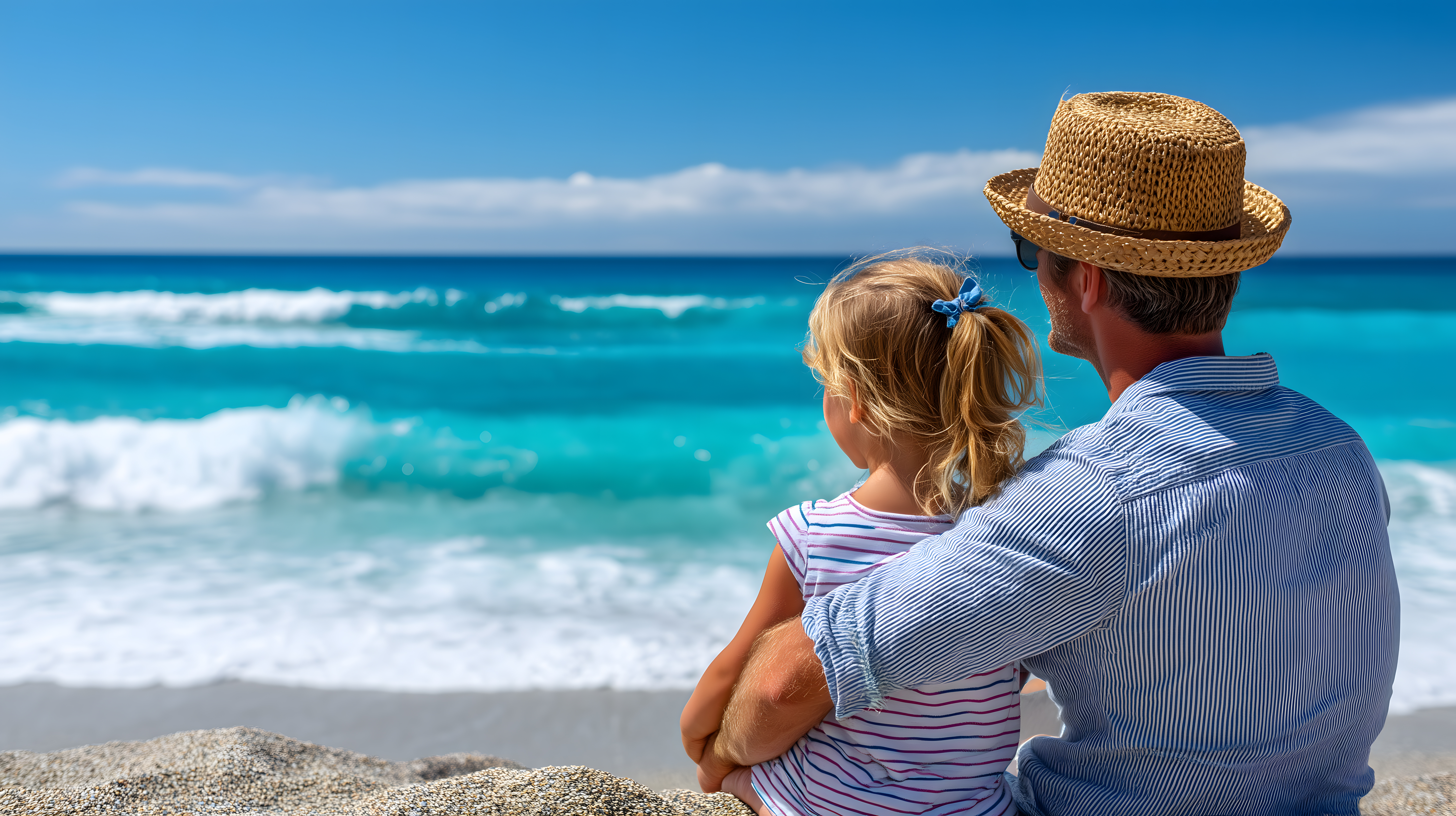 Das Bild zeigt einen Vater, der gemeinsam mit seiner Tochter am Strand sitzt und auf das türkisfarbene Meer blickt. Sie genießen die warme Sommerzeit und die friedliche Atmosphäre. Im Hintergrund sieht man den klaren, blauen Himmel und die sanft brechenden Wellen. Dieses stimmungsvolle Foto eignet sich hervorragend für den Einsatz in Urlaubsthemen, Reisebroschüren oder Blogs über Familienerlebnisse. Als hochwertiges, kostenloses Stockfoto unter der Creative Commons-Lizenz ist es frei nutzbar.