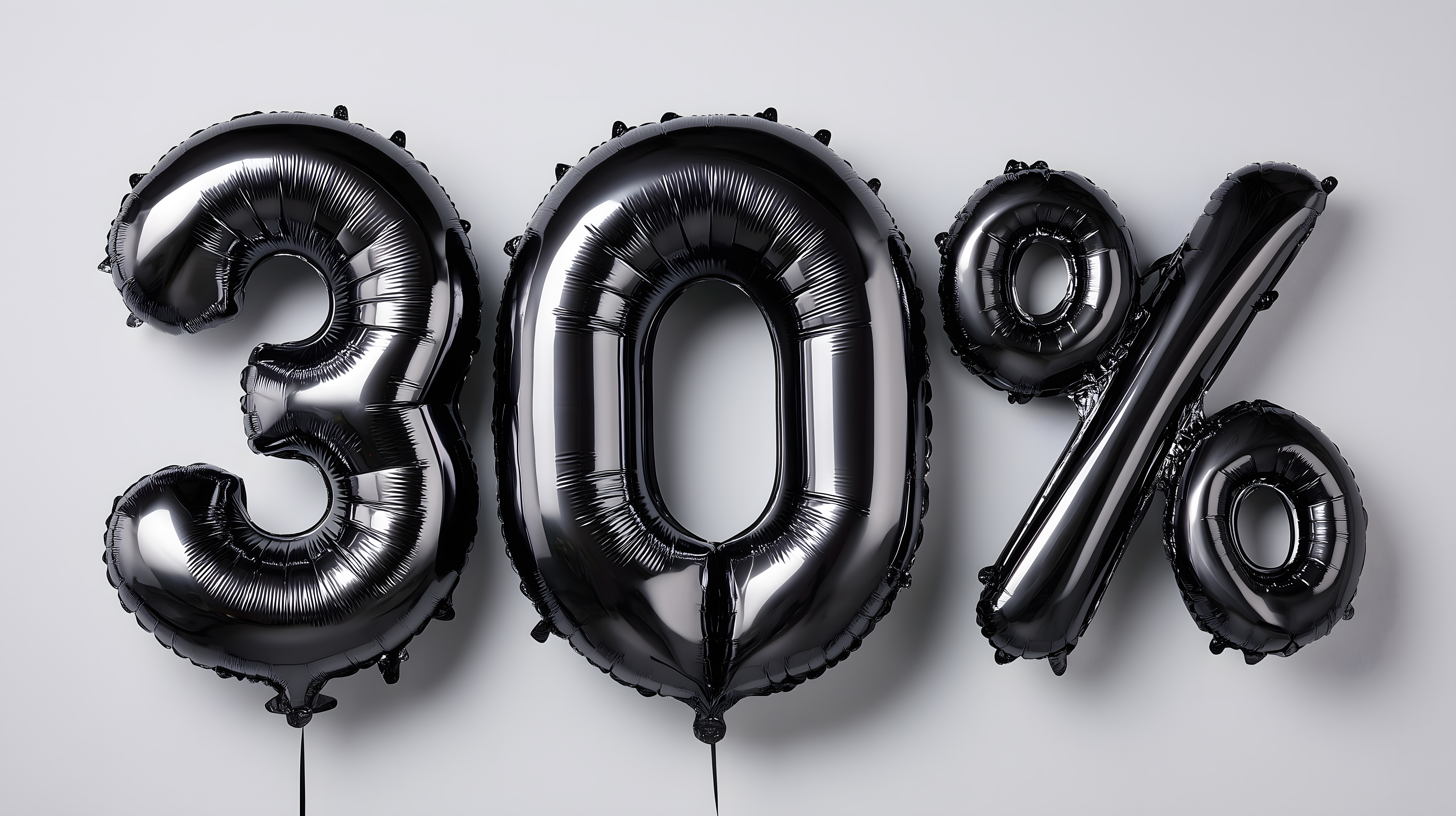 Dieses Foto zeigt mehrere schwarze Luftballons mit der Aufschrift '30%' auf einem grauen Hintergrund. Die Ballons sind in einer Reihe angeordnet und nehmen den Großteil des Bildes ein. Das Motiv eignet sich ideal für den Einsatz in Werbekampagnen, Newslettern, Blogbeiträgen oder Social-Media-Posts, die ein Angebot oder einen Rabatt bewerben. Das hochauflösende Bild ist unter einer Creative-Commons-Lizenz kostenlos für private und kommerzielle Zwecke verwendbar.