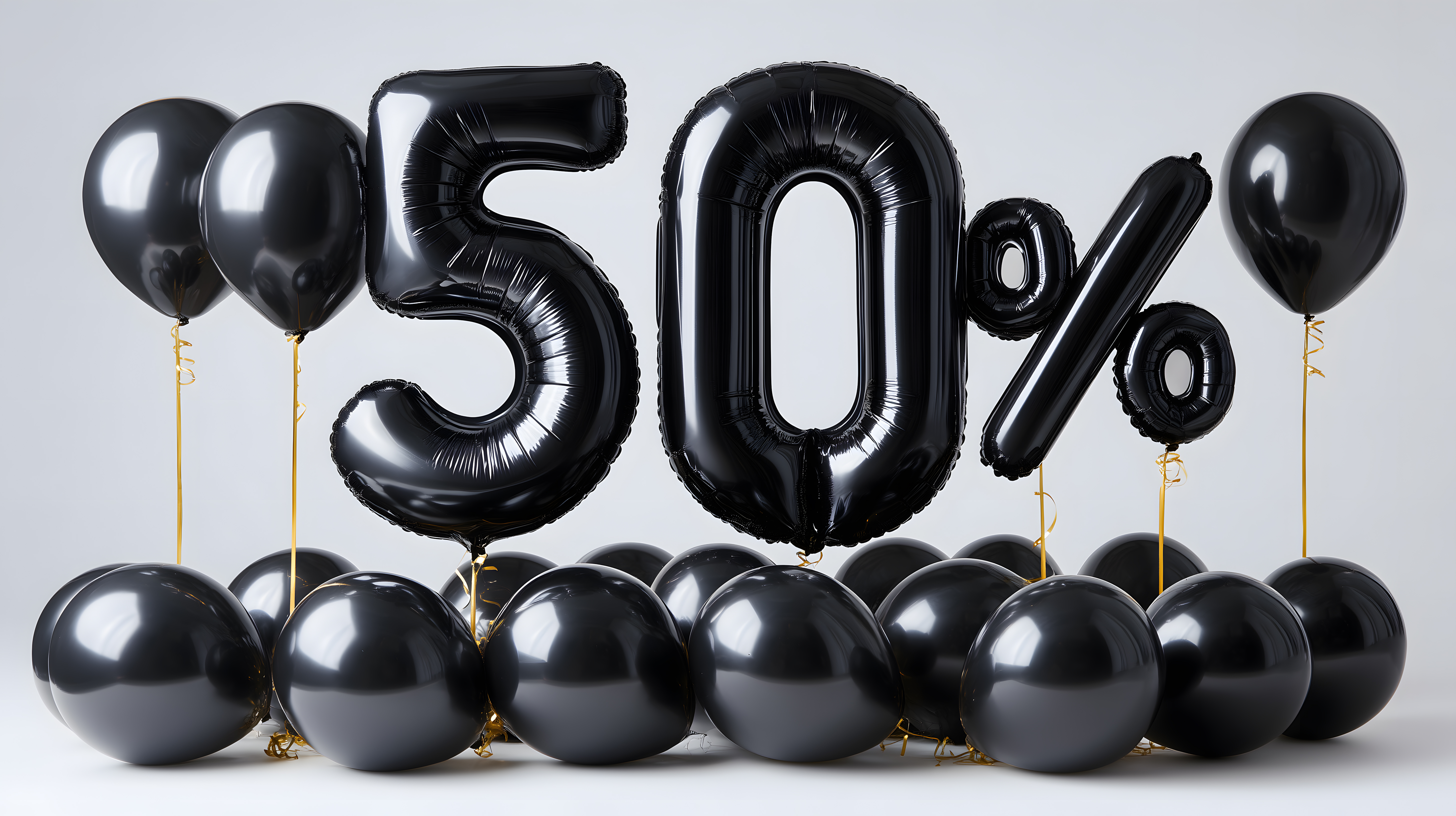 Dieses Foto zeigt eine Reihe schwarzer Heliumballons mit goldenen Schleifen. Die großen Zahlen '50%' sind in der Mitte zu sehen, was auf einen besonderen Rabatt oder eine Sonderaktion hinweist. Die Ballons stehen auf einem hellen Hintergrund, der eine optimale Präsentation ermöglicht und Platz für Textoverlay oder Produktplatzierung lässt. Dieses kostenlose Stockfoto in hoher Auflösung eignet sich perfekt für die Verwendung in Werbekampagnen, Blogbeiträgen, Social-Media-Posts oder Newslettern rund um Sonderangebote, Rabattaktionen und Verkaufsförderung.