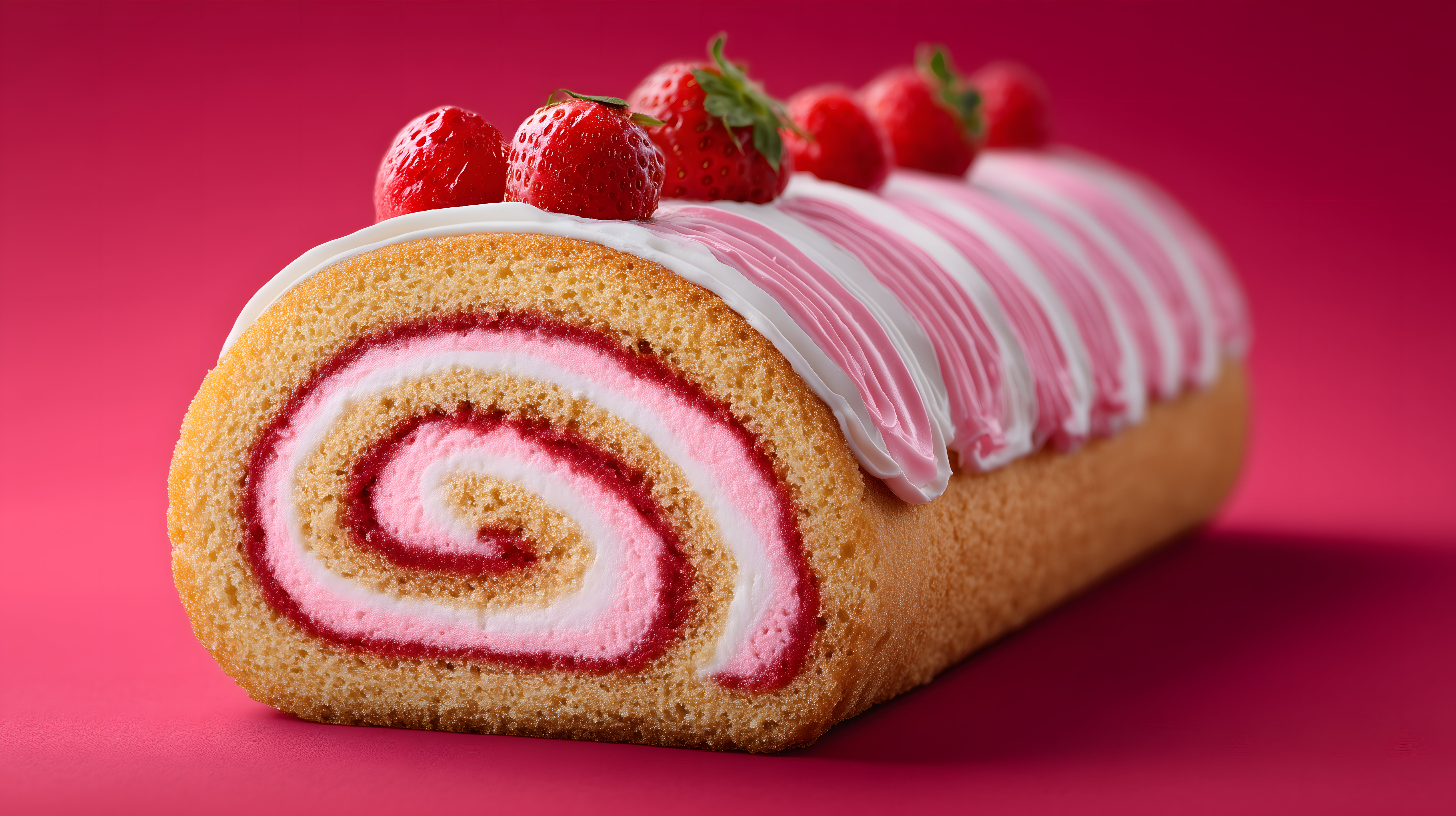 Dieses Foto zeigt eine leckere Erdbeer-Biskuitrolle mit rosa Sahne auf einem kräftig roten Hintergrund. Die Rolle ist aufgeschnitten und zeigt das spiralförmige Muster des weichen, goldbraunen Biskuits, das von der cremigen, rosa Sahne und frischen, roten Erdbeeren durchzogen ist. Die Anordnung und Färbung der Zutaten sorgt für einen appetitlichen, harmonischen Gesamteindruck. Dieses hochauflösende Stockfoto eignet sich hervorragend für Beiträge in Blogs, Social-Media-Kanälen, Newslettern oder Werbematerialien rund um das Thema Backen, Desserts oder leckere Naschereien. Es steht unter einer Creative-Commons-Lizenz zur kostenlosen Verwendung zur Verfügung.