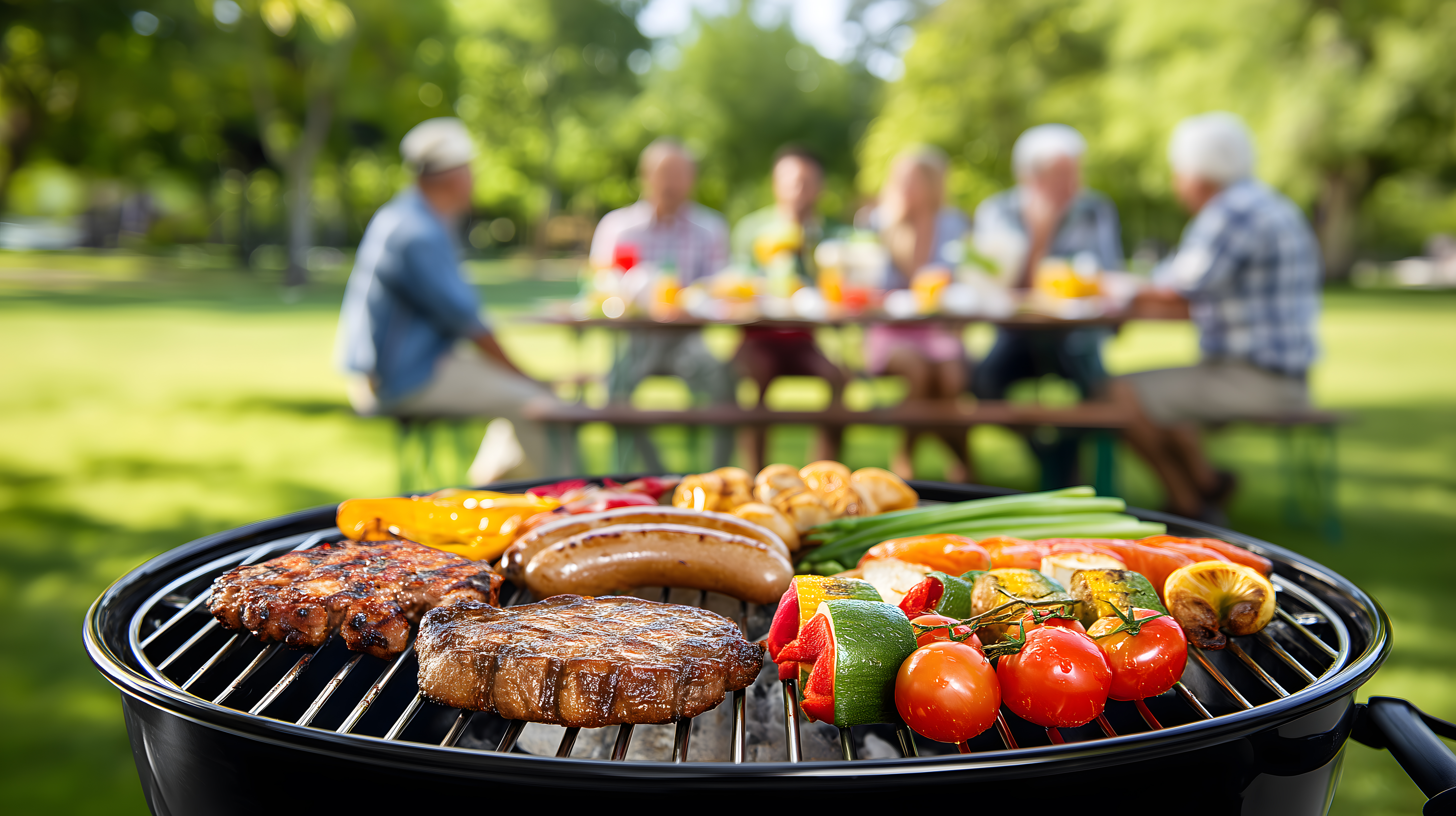 Dieses Foto zeigt eine gemütliche Grillszene im Freien. Im Vordergrund befindet sich ein Holztisch, auf dem verschiedene Grillspezialitäten wie saftige Hamburger, knackige Würstchen und gegrilltes Gemüse wie Tomaten, Paprika und Zucchini angerichtet sind. Im Hintergrund sieht man eine Gruppe von Erwachsenen, die gemeinsam an dem Tisch sitzen und genüsslich ihre Mahlzeit zu sich nehmen. Die Szenerie spielt sich in einem idyllischen Garten mit üppigem Grün ab, was dem Bild eine sommerliche und entspannte Atmosphäre verleiht. Dieses hochauflösende Foto eignet sich hervorragend für den Einsatz in Blogs, Newslettern oder Werbematerialien rund um Themen wie Gartenparty, Sommerfest oder Grillabend. Als kostenloses Stockfoto unter der Creative-Commons-Lizenz kann es frei genutzt werden.