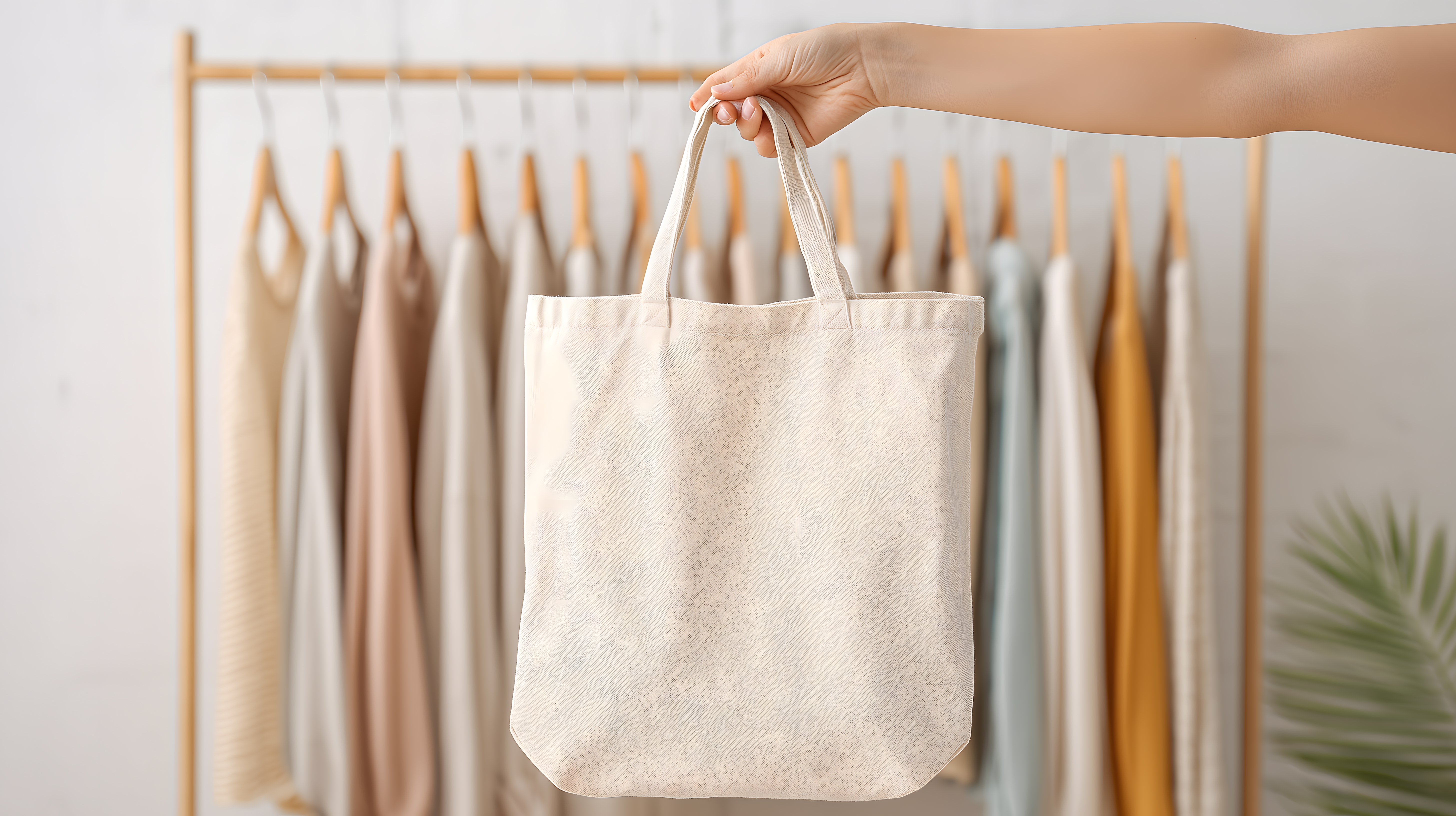 Dieses Foto zeigt eine Stofftasche, die als Mockup-Objekt vor einer Kleiderstange platziert wurde. Die Tasche ist in einem neutralen, beigen Farbton gehalten und hat ein schlichtes, minimalistisches Design. Sie steht als Platzhalter für Werbung, Magazin- oder Katalog-Layouts, bei denen Textilprodukte präsentiert werden sollen. Die Tasche vermittelt einen Eindruck von Nachhaltigkeit und Ökomode, passend für den Einsatz in Magazinen oder Online-Shops rund um Textilien, Mode und Bekleidung. Das Foto ist in hoher Auflösung und unter einer Creative-Commons-Lizenz verfügbar, sodass es für verschiedene kommerzielle und redaktionelle Zwecke kostenfrei genutzt werden kann.