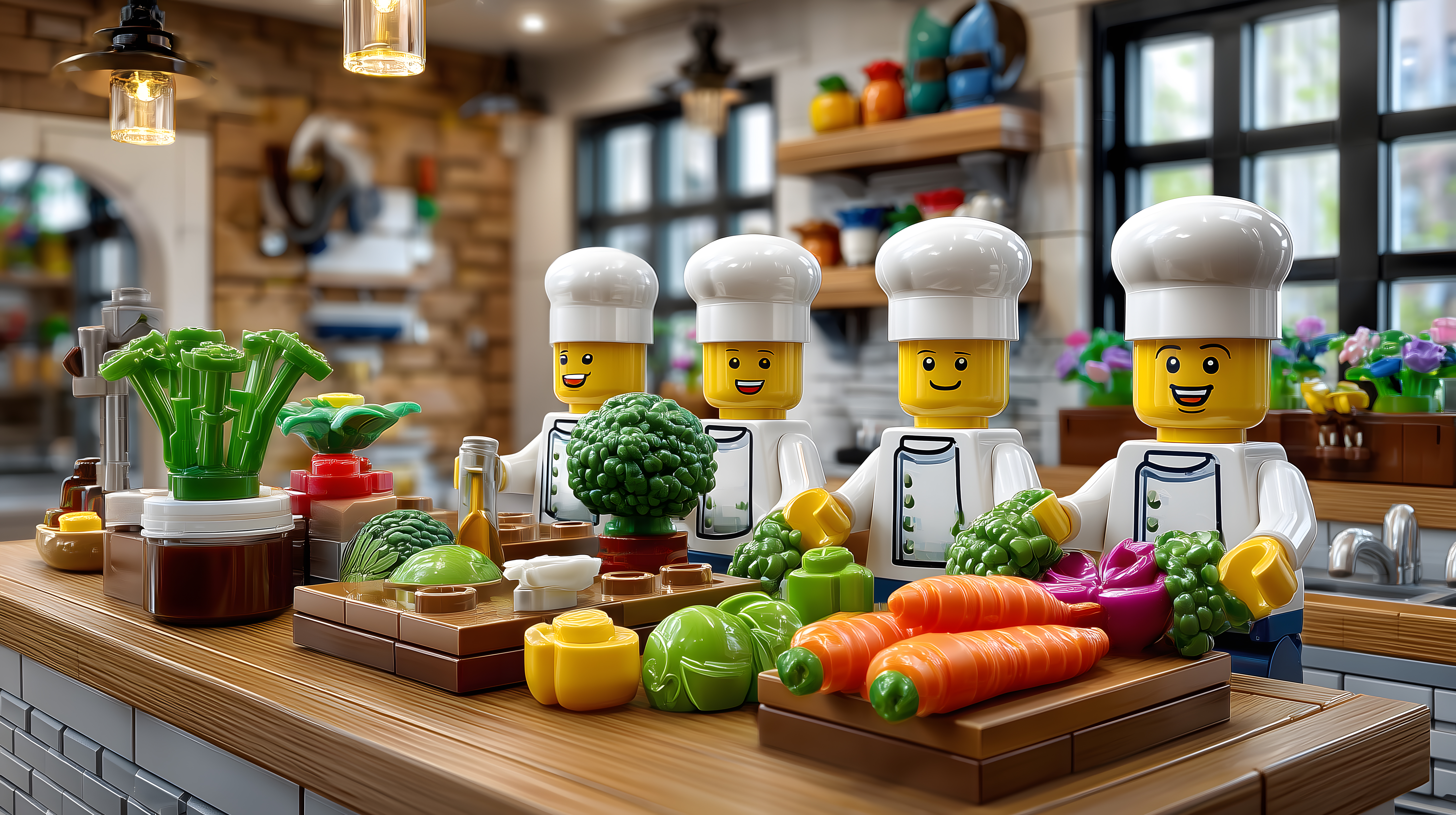 Das Bild zeigt eine moderne, helle Küchenumgebung mit lustigen, lego-ähnlichen Kochfiguren, die verschiedene Lebensmittel wie Gemüse, Gewürze und Küchenutensilien vor sich haben. Die Figuren tragen weiße Kochmützen und lächeln fröhlich, was eine einladende, freundliche Atmosphäre vermittelt. Das Bild ist in einer 3D-Darstellung gehalten und erscheint sehr stilisiert und illustrativ. Es eignet sich hervorragend als Stockfoto für Blog-Beiträge, Newsletter oder Social-Media-Posts rund um das Thema Kochen, Rezepte und Kulinarik. Das hochauflösende Bild steht unter einer Creative-Commons-Lizenz kostenlos zum Download bereit.