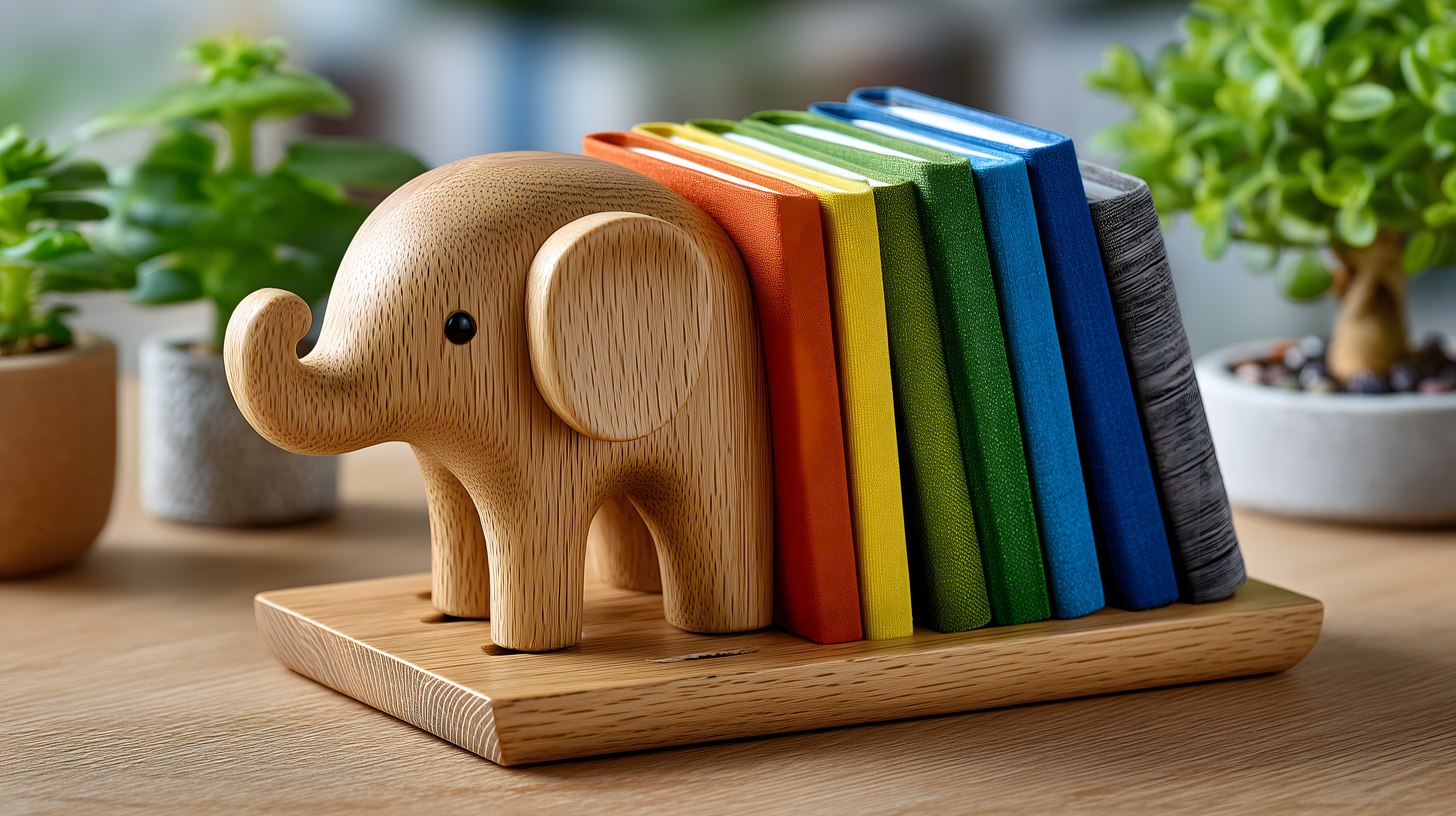 Dieses Foto zeigt eine niedliche Buchstütze in Form eines hölzernen Elefanten, die umgeben ist von bunten Kinderbüchern in einer frischen, natürlichen Umgebung. Der Elefant ist aus hellem Holz gefertigt und seine Form lässt ihn wie ein süßes Spielzeug wirken. Die Bücher dahinter sind in verschiedenen Farbtönen von Blau, Grün, Orange und Gelb gehalten, die dem Arrangement einen freundlichen, fröhlichen Charakter verleihen. Im Hintergrund sind kleine Blumentöpfe und üppige Grünpflanzen zu sehen, die das Bild vervollständigen und eine gemütliche, minimalistische Atmosphäre schaffen. Dieses kostenlose Stockfoto in hoher Auflösung ist ideal für die Verwendung in Blogs, Newslettern, Social-Media-Beiträgen oder Werbekampagnen mit einem natürlichen, kreativen Look und Feel.