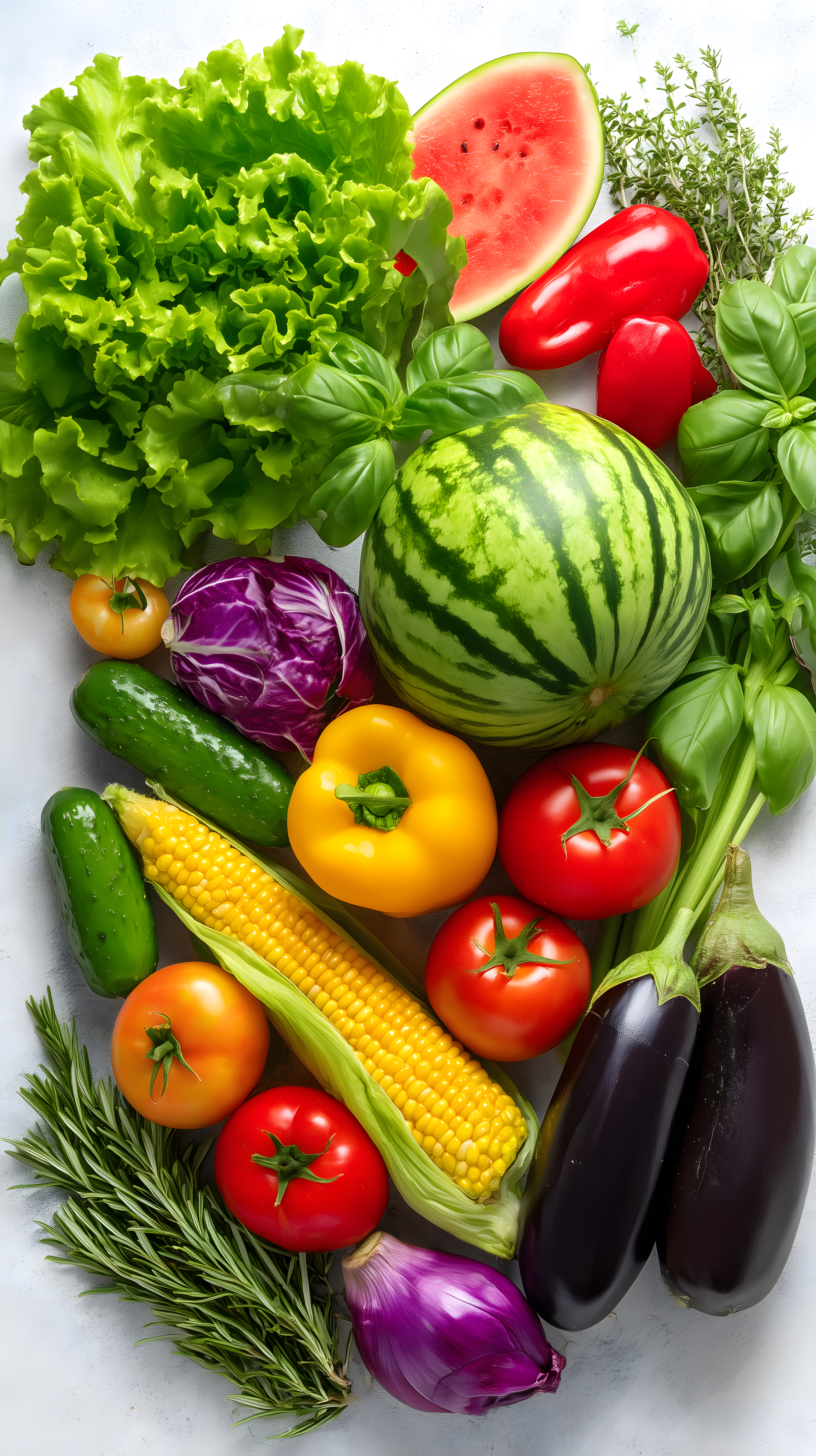 Dieses Foto zeigt eine Anordnung von frischem Obst und Gemüse auf weißem Hintergrund. Im Vordergrund sehen wir eine Vielzahl an Lebensmitteln wie Tomaten, Paprika, Gurken, Mais, Auberginen und verschiedene Kräuter wie Basilikum und Rosmarin. Die Produkte sind in einem rustikalen Stil angeordnet und zeigen die Vielfalt an gesunden, natürlichen Zutaten. Dieses Stockfoto eignet sich ideal für Themen rund um gesunde Ernährung, Kochen, Vegetarismus oder Landwirtschaft und kann kostenfrei in hoher Auflösung unter einer Creative-Commons-Lizenz verwendet werden.