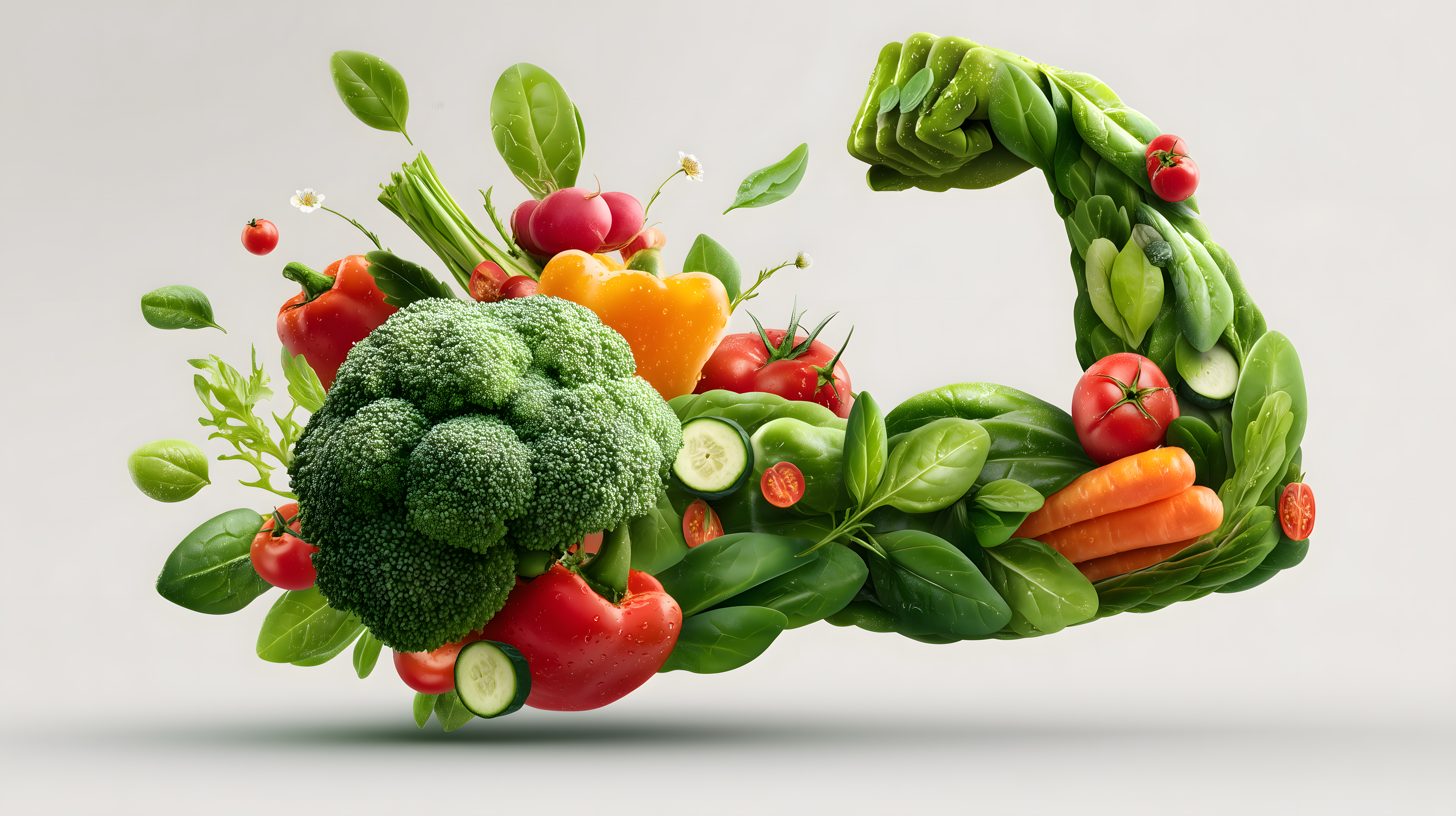Das Bild zeigt eine kreative Anordnung verschiedener frischer Obst- und Gemüsesorten, die einen muskulösen Arm bilden. Grüner Brokkoli, rote Paprika, gelbe Karotten und weitere bunte Elemente vermitteln den Eindruck von Kraft, Vitalität und gesunder Ernährung. Das Motiv eignet sich hervorragend für Werbe- und Marketingmaterialien im Bereich Ernährungsberatung, Kochrezepte oder Fitness-Themen. Als hochauflösendes Stockfoto unter Creative Commons-Lizenz ist es für kommerzielle und private Zwecke frei nutzbar.