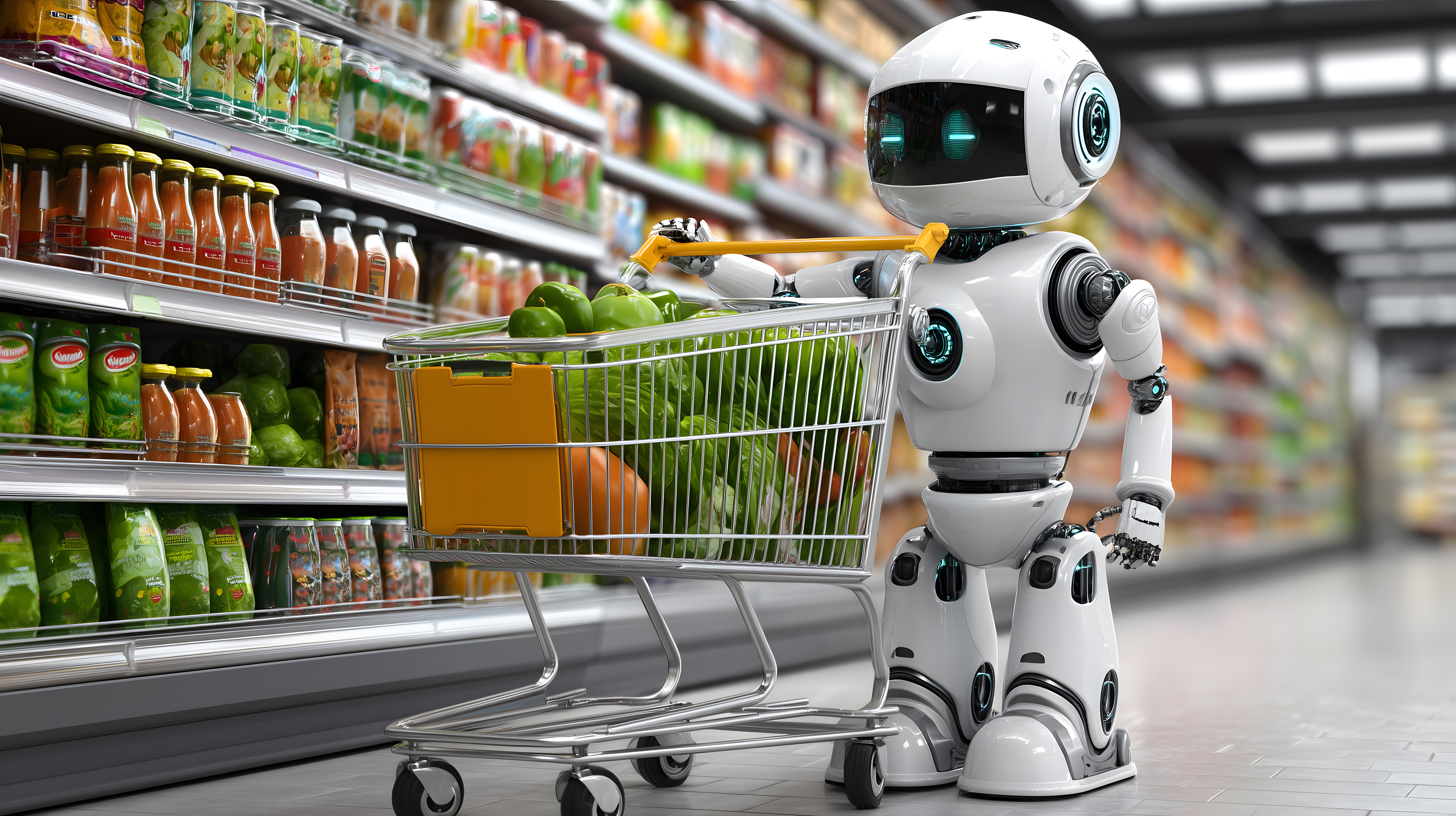 Das Bild zeigt einen humanoiden Roboter, der einen Einkaufswagen durch die Regale eines Supermarkts schiebt. Der Roboter ist weiß und hat eine kameraähnliche Linse als Kopf. Der Einkaufswagen ist mit frischem Obst und Gemüse gefüllt, das in den Regalreihen hinter dem Roboter aufgereiht ist. Das Bild vermittelt einen Eindruck von der möglichen Zukunft des Einzelhandels, in der Roboter zunehmend Aufgaben übernehmen. Als kostenloses Stockfoto in hoher Auflösung und unter Creative-Commons-Lizenz eignet sich das Bild hervorragend für den Einsatz in Blogbeiträgen, Newslettern, Werbematerialien und auf Social-Media-Kanälen rund um Themen wie Technologie, Automatisierung und die Zukunft des Einzelhandels.