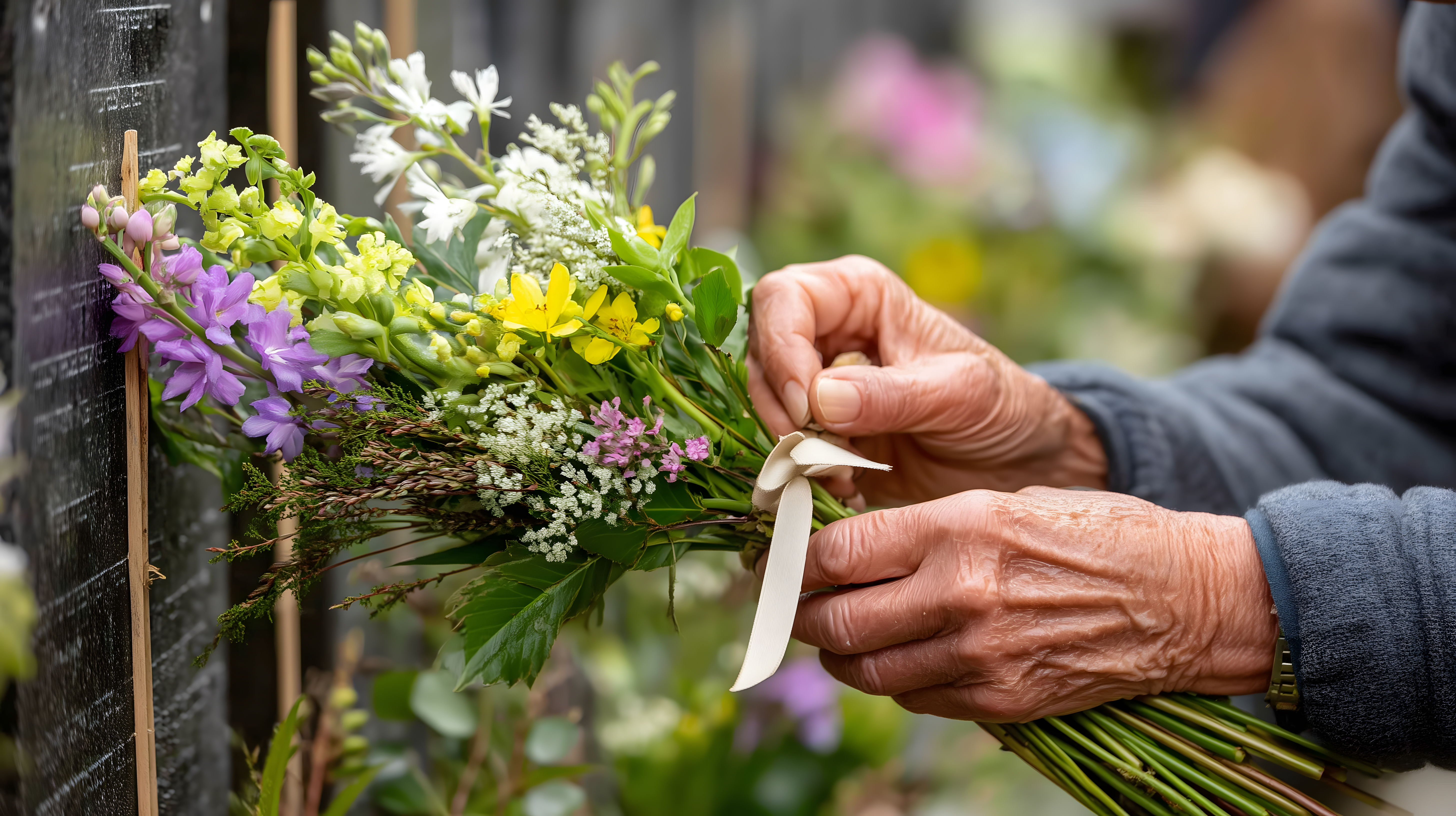 Das Foto zeigt eine Seniorin, die mit ihren Händen einen liebevoll gestalteten Blumenstrauß an einem Gedenkort befestigt. Die Blumen in kräftigen, natürlichen Farben wie Gelb, Lila und Weiß verleihen dem Bild eine meditative und friedliche Stimmung. Der Fokus liegt auf den faltigen Händen der älteren Person, die zärtlich mit den Blumen umgehen. Das Foto eignet sich ideal für Hintergründe, Blogger-Artikel, Newsletter-Illustrationen oder Social-Media-Posts zum Thema Gedenken, Trauer, Friedhof oder Gartenarbeit. Dieses hochauflösende, kostenlose Stockfoto unter Creative-Commons-Lizenz ist vielseitig einsetzbar.