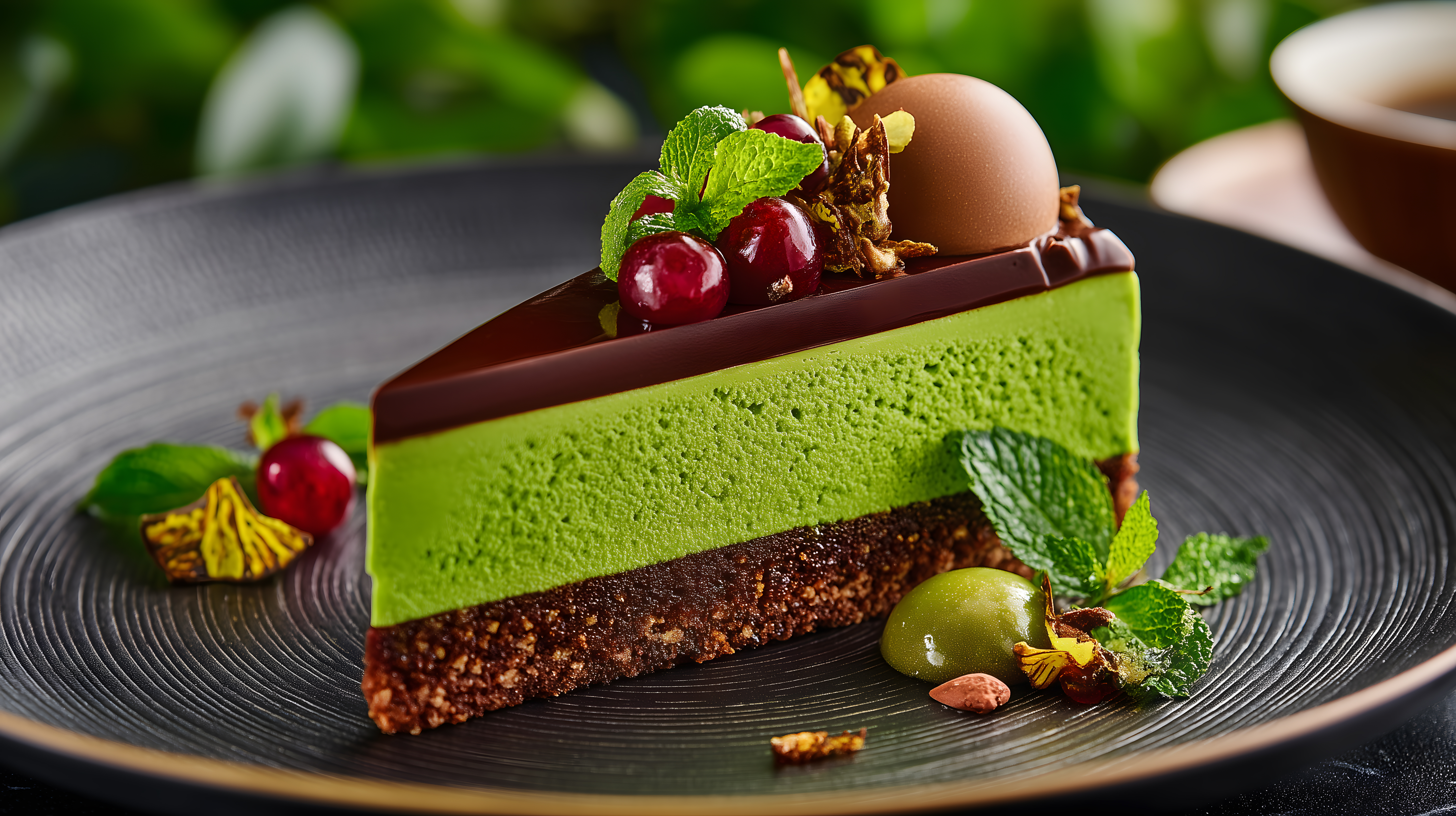 Dieses Foto zeigt eine raffinierte, matcha-grüne Torte, die mit einer dunklen Schokoladenglasur überzogen ist. Auf der Oberfläche befinden sich dekorativ angeordnete Früchte wie Kirschen und Weintrauben sowie frische Minzblätter. Das Gericht wurde vor einem grünen, unscharfen Hintergrund fotografiert, was einen frischen und natürlichen Eindruck vermittelt. Diese Torte wäre ein perfekter Hingucker für ein kreatives Dessert-Menü, einen Blogbeitrag zum Thema Patisserie oder eine appetitanregende Werbung für Feinkostladen. Das hochauflösende Foto ist als kostenloses Stockfoto unter der Creative-Commons-Lizenz verfügbar.