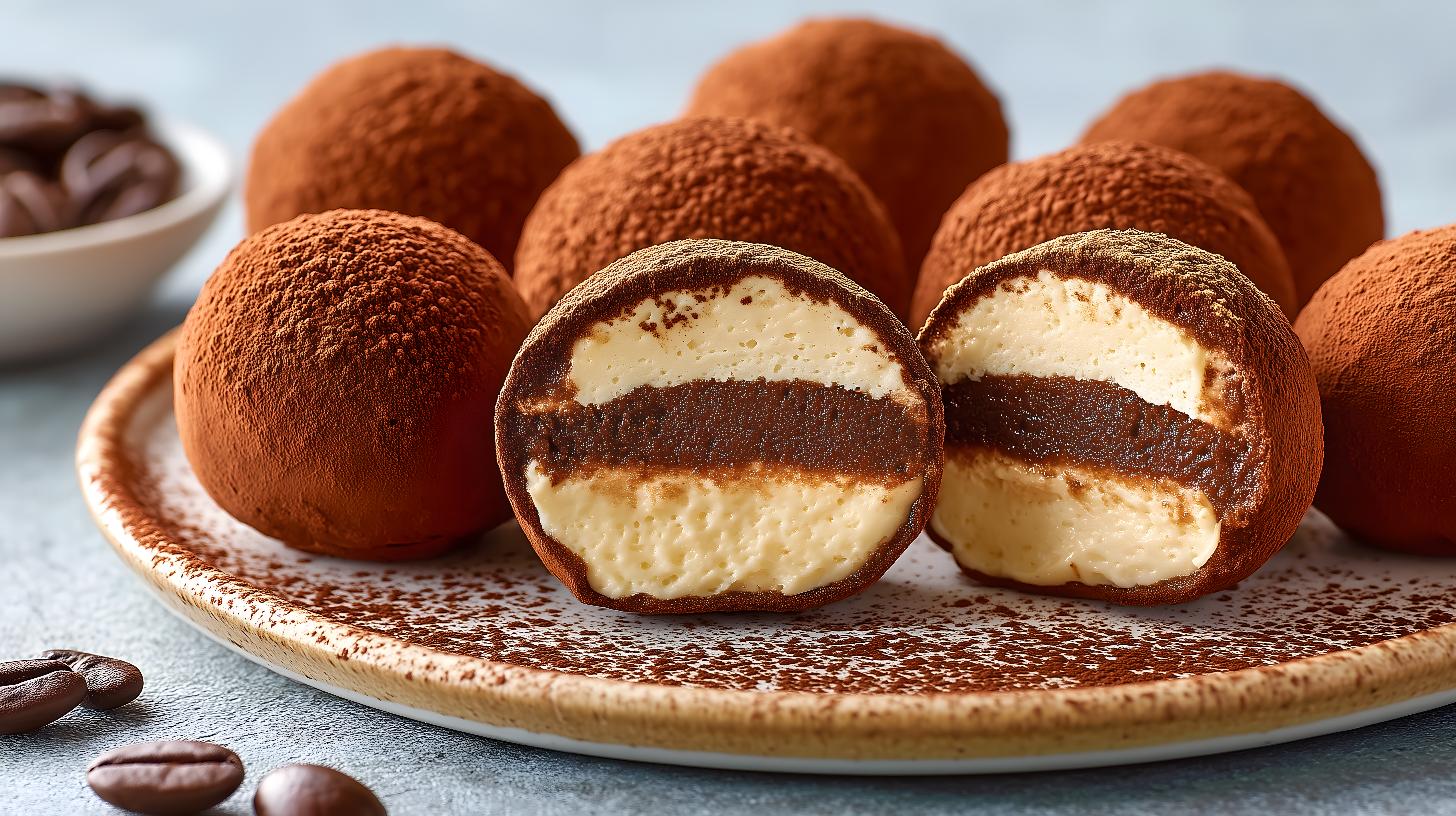 Das Bild zeigt eine Auswahl köstlicher Tiramisu-Kugeln, die auf einem runden Keramikteller angerichtet sind. Die runden, braunen Kugeln sind mit einer feinen Schicht Kakao überzogen und offenbaren im Inneren eine cremige, helle Füllung. Neben den Kugeln sind einige Kaffeebohnen verstreut, die den italienischen Charakter des Desserts unterstreichen. Das Arrangement in der rustikalen Schale wirkt einladend und lässt Appetit auf ein Stück Tiramisu aufkommen.