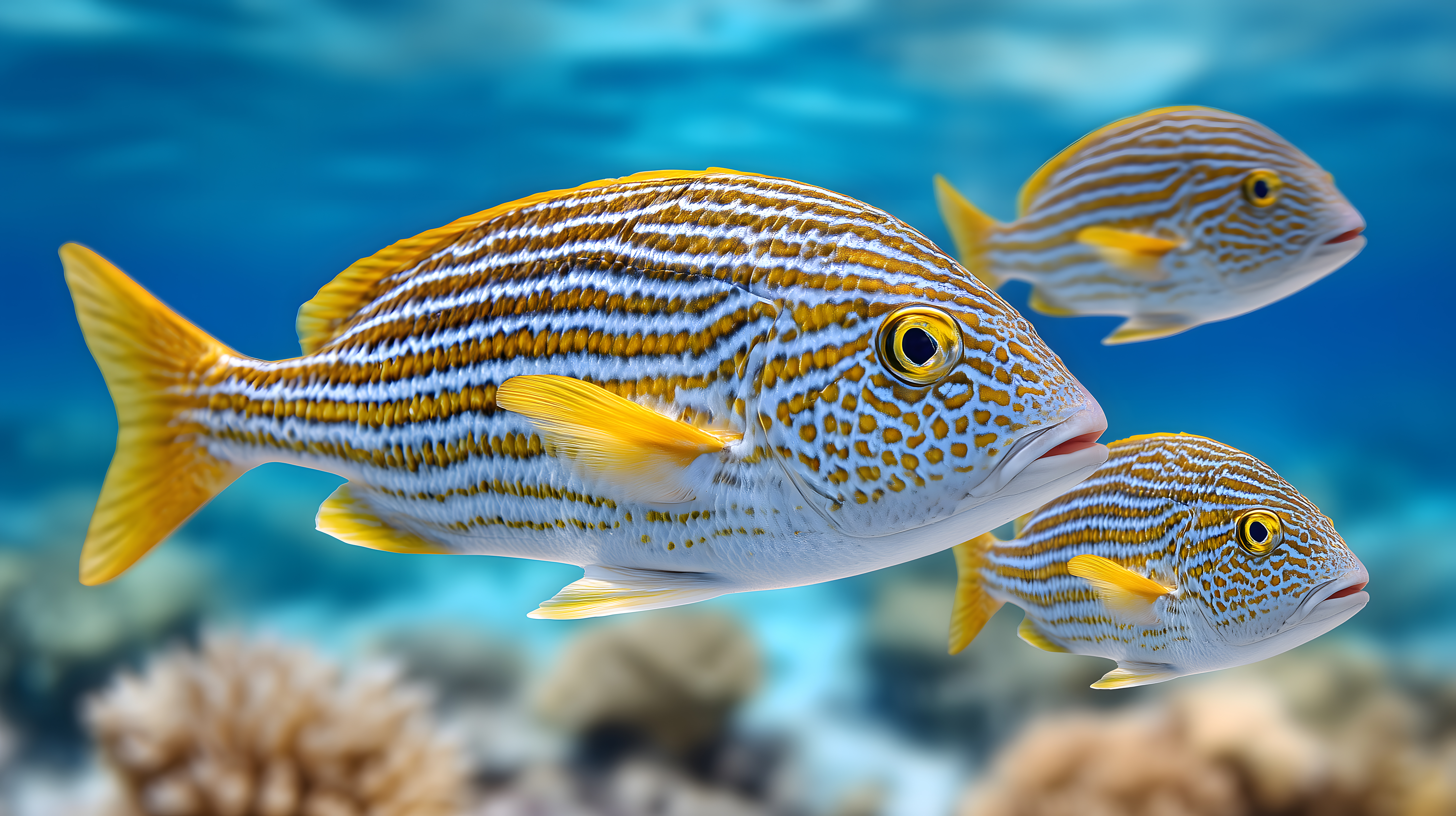 Dieses Foto zeigt eine Gruppe bunter Riffbewohner in kristallklarem, türkisfarbenem Meerwasser. Es sind drei verschiedene Arten von Korallenfischen mit auffallend gestreiftem Muster zu sehen. Die Fische erscheinen in leuchtenden Farbtönen wie Orange, Gelb und Blau. Ihre geschmeidigen Bewegungen und das glasklare Wasser verleihen der Unterwasserszene eine friedliche, fast meditative Atmosphäre.