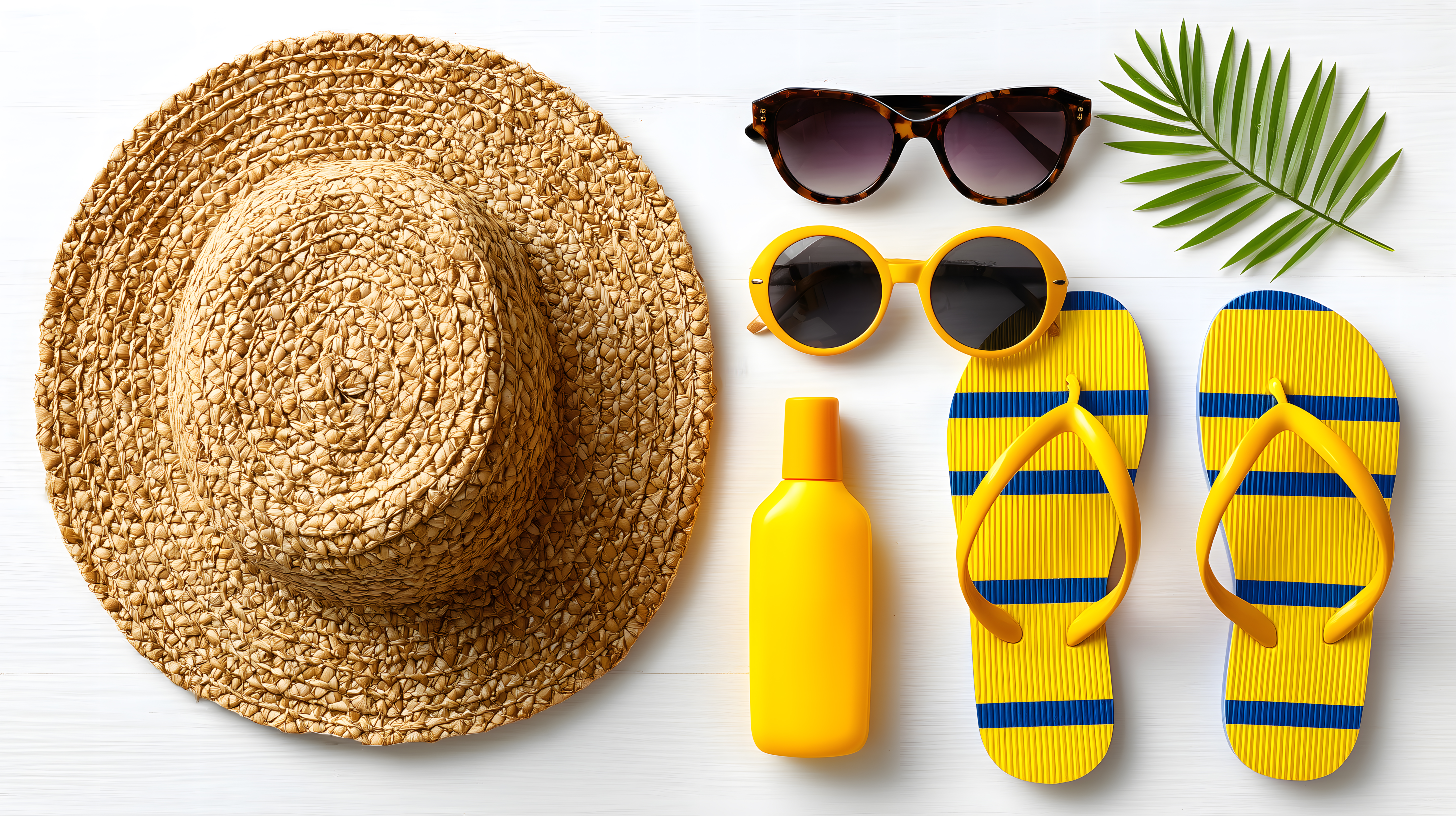 Dieses Foto zeigt eine stimmungsvolle Anordnung von Sommerzubehör auf weißem Hintergrund. Im Zentrum befindet sich ein großer, gewebter Strohhut, umgeben von gelben Sonnenbrillen, gestreiften Flip-Flops und einer Flasche Sonnencreme. Die Szene wird durch tropische Palmblätter ergänzt, die einen exotischen, entspannten Sommerurlaub assoziieren. Dieses hochauflösende Stockfoto lässt sich hervorragend für Blogbeiträge, Werbeanzeigen, Social-Media-Posts und andere Medien rund um Reise, Mode und Lifestyle verwenden. Es steht unter einer Creative-Commons-Lizenz zur kostenlosen Nutzung bereit.