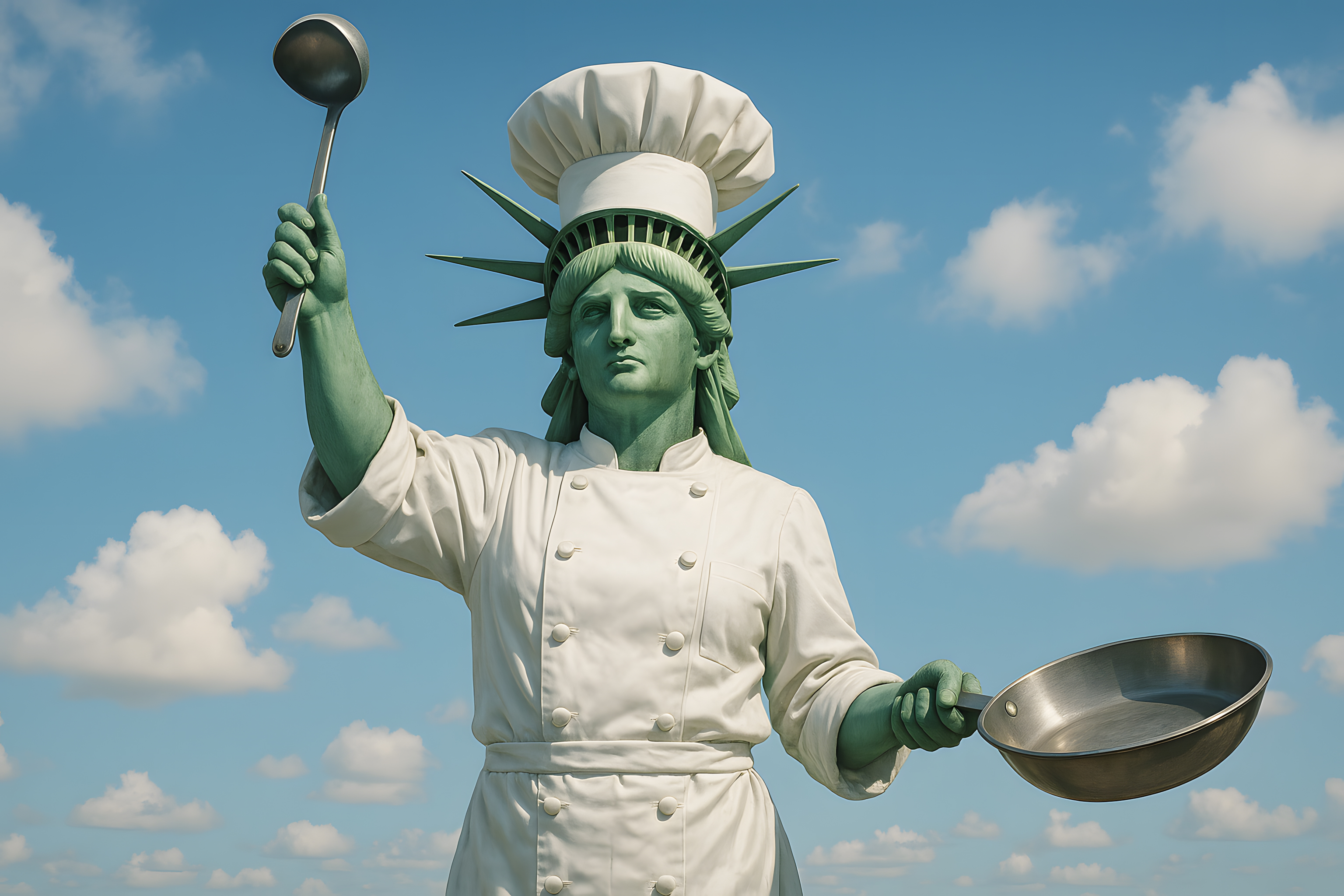 Das Bild zeigt eine Fotomontage, in der die bekannte Freiheitsstatue als Köchin dargestellt wird. Sie trägt eine weiße Kochjacke und eine große Kochmütze, in den Händen hält sie eine Suppenkelle und eine Bratpfanne. Der Hintergrund zeigt einen blauen Himmel mit flauschigen weißen Wolken, was dem Bild eine heitere und leichte Stimmung verleiht. Diese Darstellung der Freiheitsstatue als Köchin ist eine kreative und humorvolle Interpretation des amerikanischen Symbols. Das Foto eignet sich hervorragend als kostenloses Stockfoto für Blog-Beiträge, Newsletter oder Social-Media-Posts, die sich um Kulinarik, amerikanische Themen oder Konzeptkunst drehen. Es ist in hoher Auflösung verfügbar und unter einer Creative-Commons-Lizenz nutzbar.