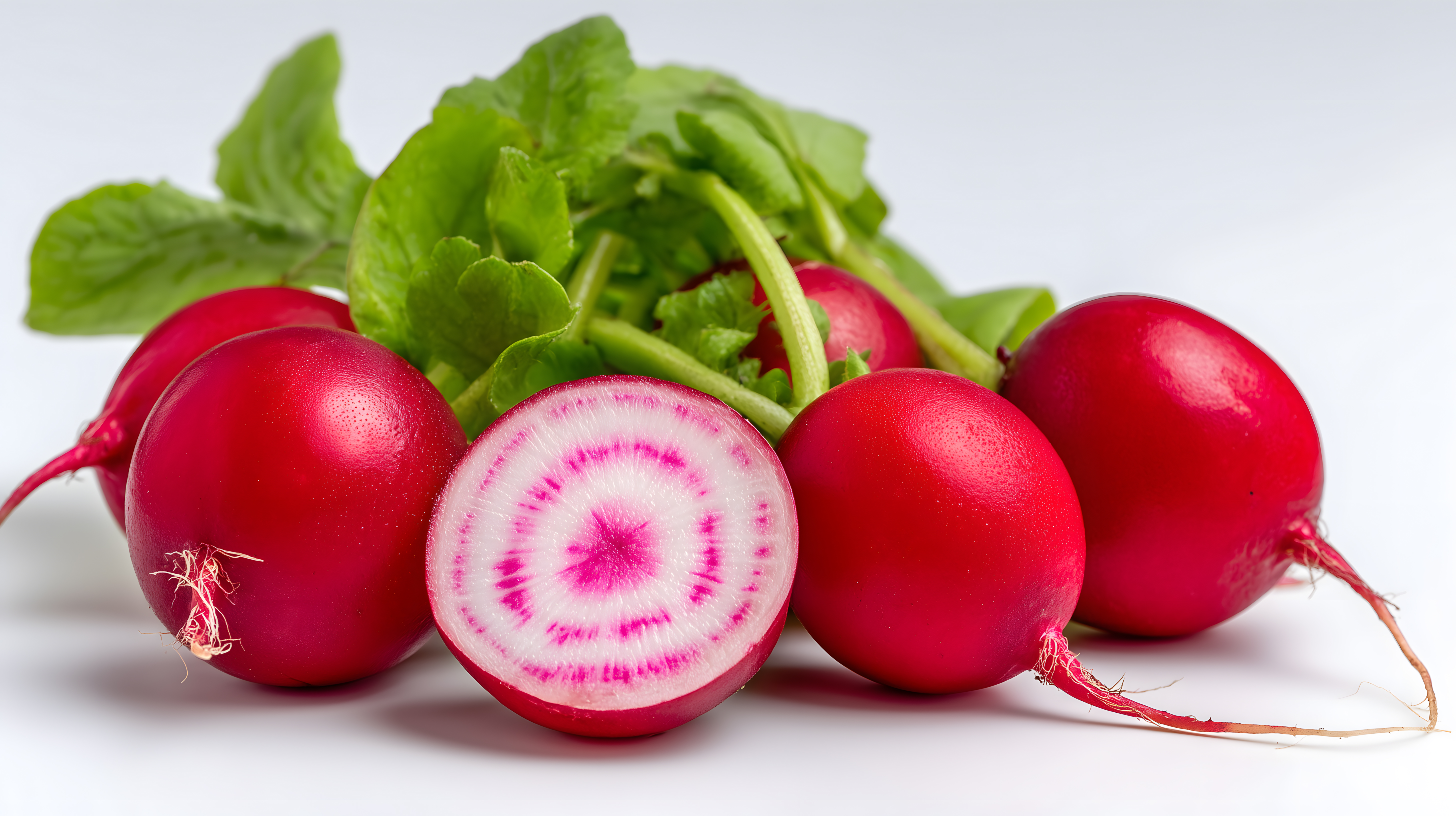 Dieses hochauflösende Stockfoto zeigt eine Nahaufnahme von frischen, knackigen Radieschen mit ihren grünen Blättern auf einem weißen Hintergrund. Die leuchtendroten Radieschen sind angeschnitten, so dass man den dekorativen rosa-weißen Muster-Querschnitt sehen kann. Das Bild strahlt Frische, Sauberkeit und Natürlichkeit aus und eignet sich hervorragend für Rezeptblogs, Newsletter, Social-Media-Beiträge oder Werbematerial rund um gesunde Ernährung, vegetarische und vegane Küche. Als kostenloses Stockfoto unter der Creative-Commons-Lizenz kannst du es ohne Einschränkungen für deine Projekte nutzen.