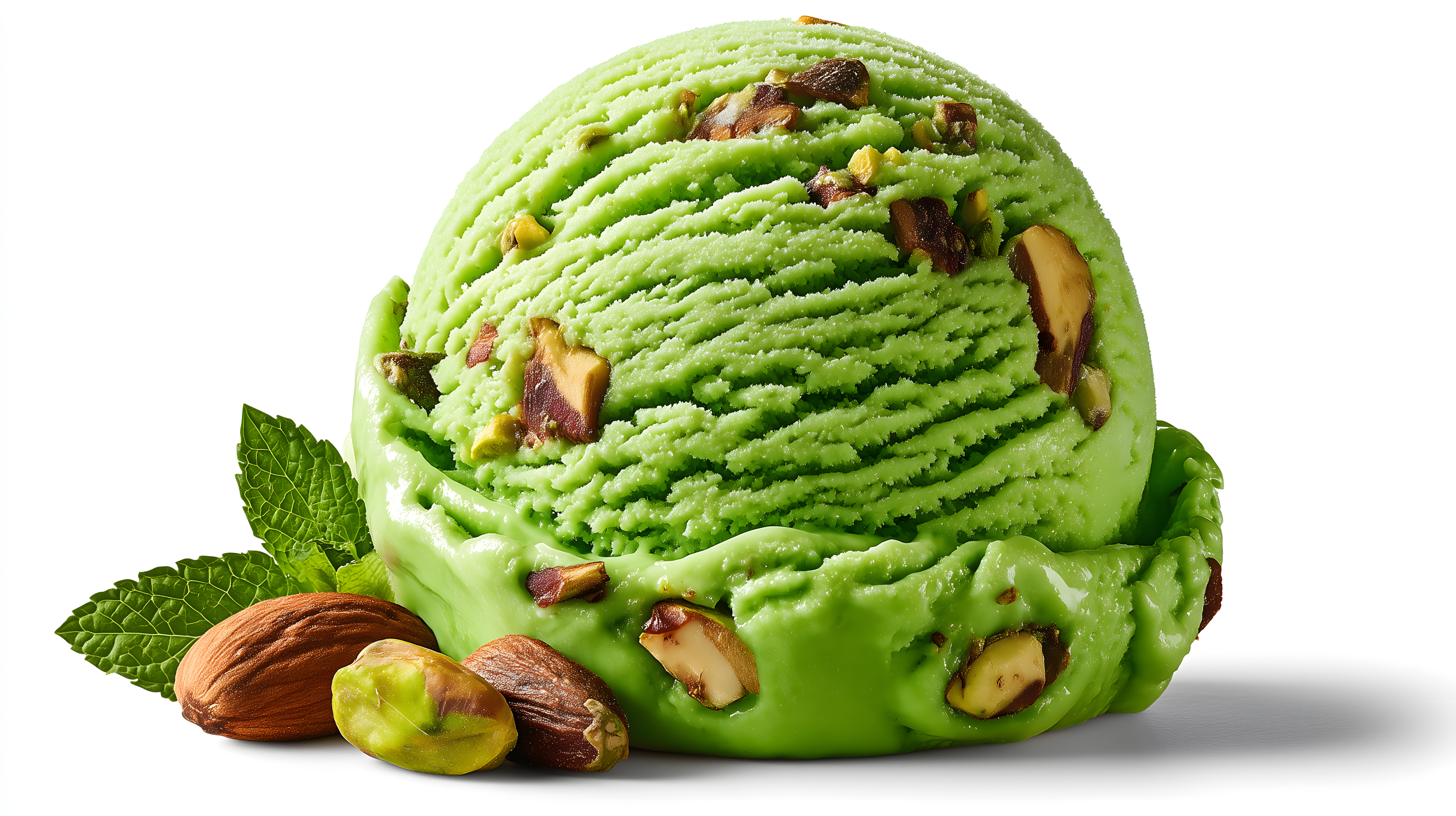 Dieses Foto zeigt einen Eisbecher voller cremiger, hellgrüner Pistazieneis-Kugeln. Die Eiskugeln sind mit ganzen Pistazien und Mandeln sowie frischen Minzblättern garniert, die dem Foto einen natürlichen, frischen Akzent verleihen. Der Kontrast zwischen dem satten Grün des Pistazieneises und den helleren Nusstönen schafft eine appetitliche Optik. Das Bild eignet sich perfekt als Stockfoto für Lebensmittelrezepte, Desserts, Sommergetränke oder Foodblog-Beiträge in hoher Auflösung und unter Creative-Commons-Lizenz.