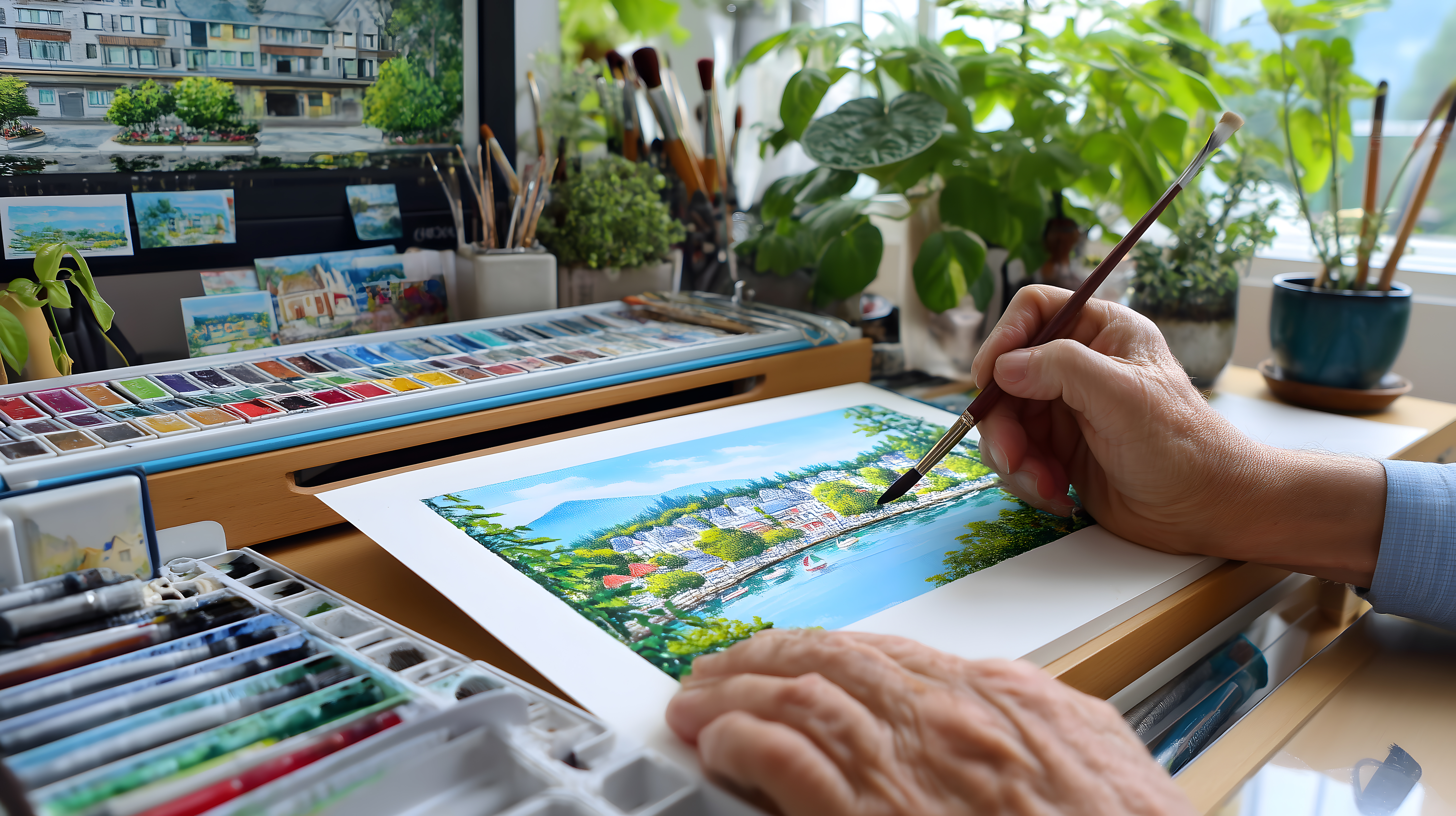 Dieses Foto zeigt eine künstlerische Szene am Fenster. Im Vordergrund sehen wir eine Hand, die mit einem Pinsel an einem Aquarellgemälde arbeitet. Auf dem Tisch befinden sich weitere Malutensilien wie Farbpaletten und Pinsel. Im Hintergrund ist durch das Fenster eine idyllische Landschaft mit Bergen, Bäumen und einem See zu erkennen. Die Farben des Gemäldes spiegeln die Farben der Natur wider. Das Bild vermittelt eine ruhige, kreative Atmosphäre und eignet sich als kostenloses Stockfoto für Blogs, Newsletter, Social-Media-Beiträge oder Werbematerialien in hoher Auflösung und unter Creative-Commons-Lizenz.