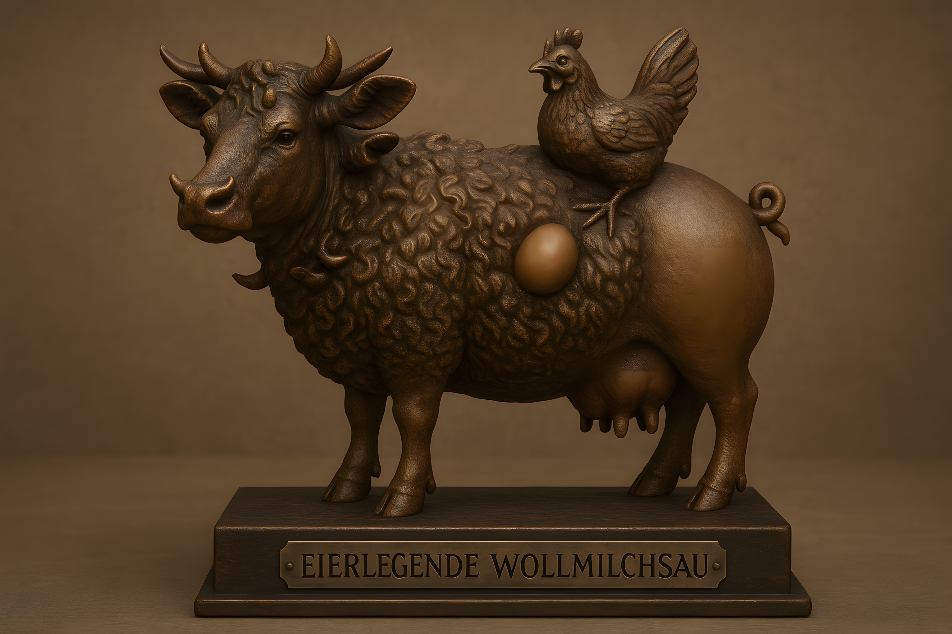 Diese bronze-farbene Skulptur zeigt die mythische 'Eierlegende Wollmilchsau', eine Metapher für ein Wesen mit vielfältigen, meist widersprüchlichen Eigenschaften. Die detailliert modellierte Figur aus einem warmen, erdigen Braun zeigt eine Kuh mit Hörnern, deren Körper von kräftigen Locken bedeckt ist. Auf ihrem Rücken befindet sich ein stolzes Huhn, das ein Ei bewacht. Diese einzigartige Komposition erschafft ein stimmungsvolles, vintage-artiges Bild voller symbolischer Bedeutung. Das hochwertige Foto in hoher Auflösung eignet sich ideal für den Einsatz in Blogs, Newslettern, Social-Media-Beiträgen oder Werbematerialien. Es steht unter einer Creative-Commons-Lizenz kostenfrei zur Verfügung.