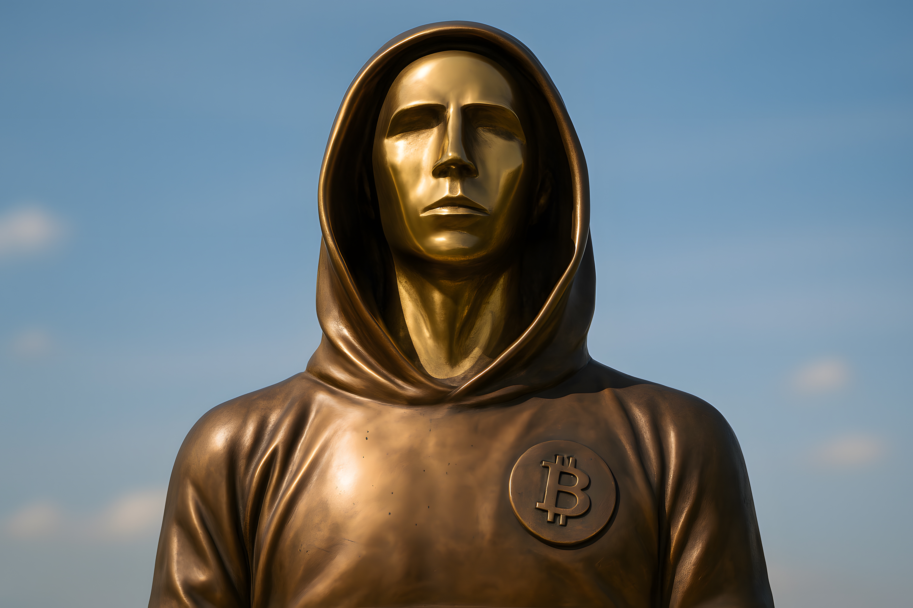 Dieses Bild zeigt eine monumentale, goldene Statue, die eine verhüllte Gestalt darstellt. Auf ihrer Brust befindet sich ein großes Bitcoin-Symbol, was auf die Kryptowährung Bitcoin als Thema hinweist. Die Statue steht vor einem klaren, blauen Himmel, was einen kontrastreichen und dramatischen Hintergrund schafft. Das Foto vermittelt einen Eindruck von Größe, Bedeutung und Symbolik rund um die innovative Technologie der Blockchain und Kryptowährungen. Dieses hochauflösende Stockfoto in freier Lizenz eignet sich hervorragend für Blogbeiträge, Newsletter, Social-Media-Posts oder Werbematerialien zum Thema Finanztechnologie, Digitalisierung und die Zukunft des Geldes.