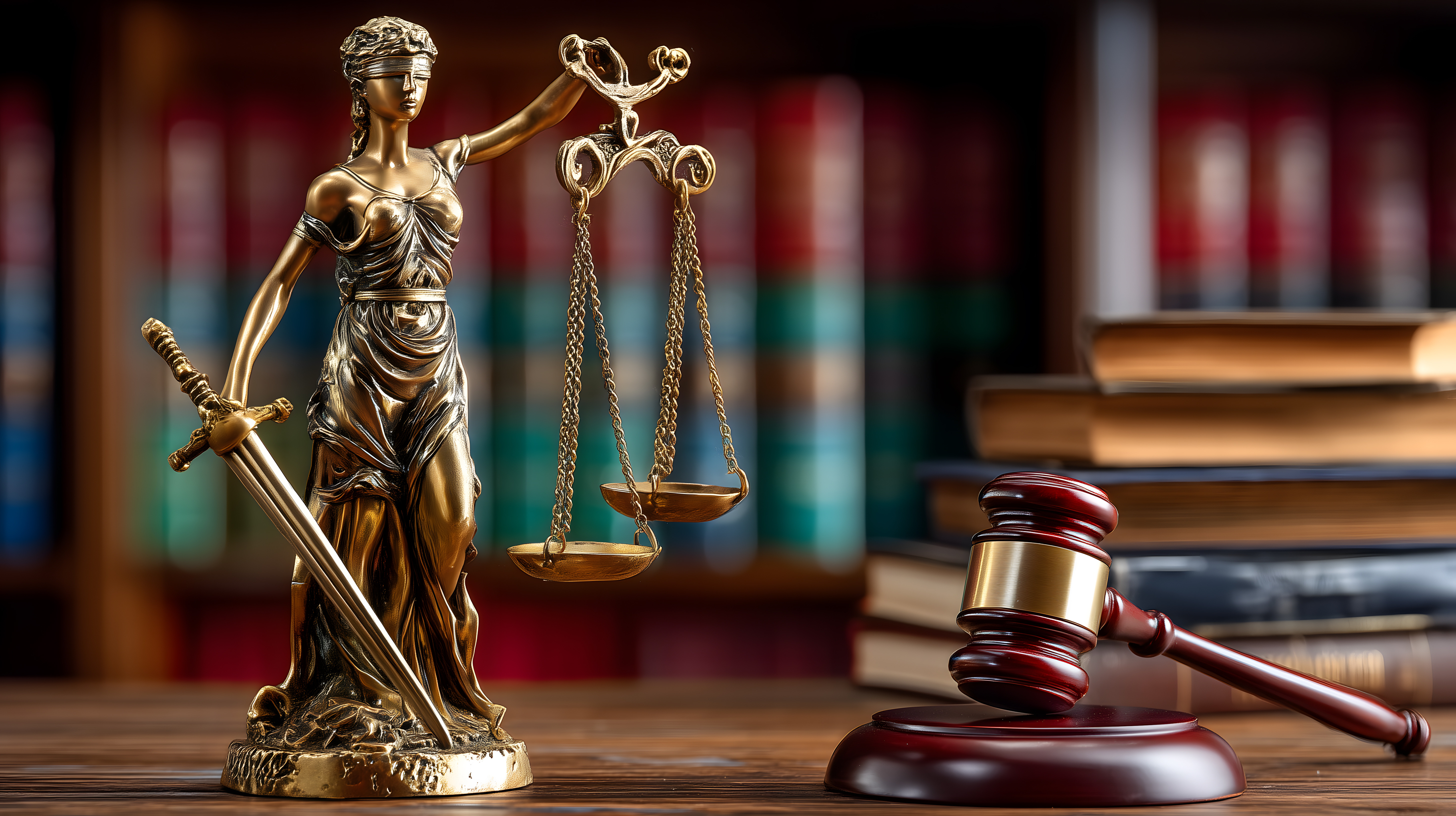 Das Bild zeigt eine Statue der Justitia, der römischen Göttin der Gerechtigkeit, inmitten von Gesetzesbüchern. Die Figur steht auf einem dunklen Holztisch und hält in ihrer erhobenen rechten Hand ein goldenes Schwert, während ihre linke Hand eine Waage der Gerechtigkeit hält. Der Hintergrund ist in warmen Rottönen gehalten, die dem Bild eine klassische, feierliche Atmosphäre verleihen.