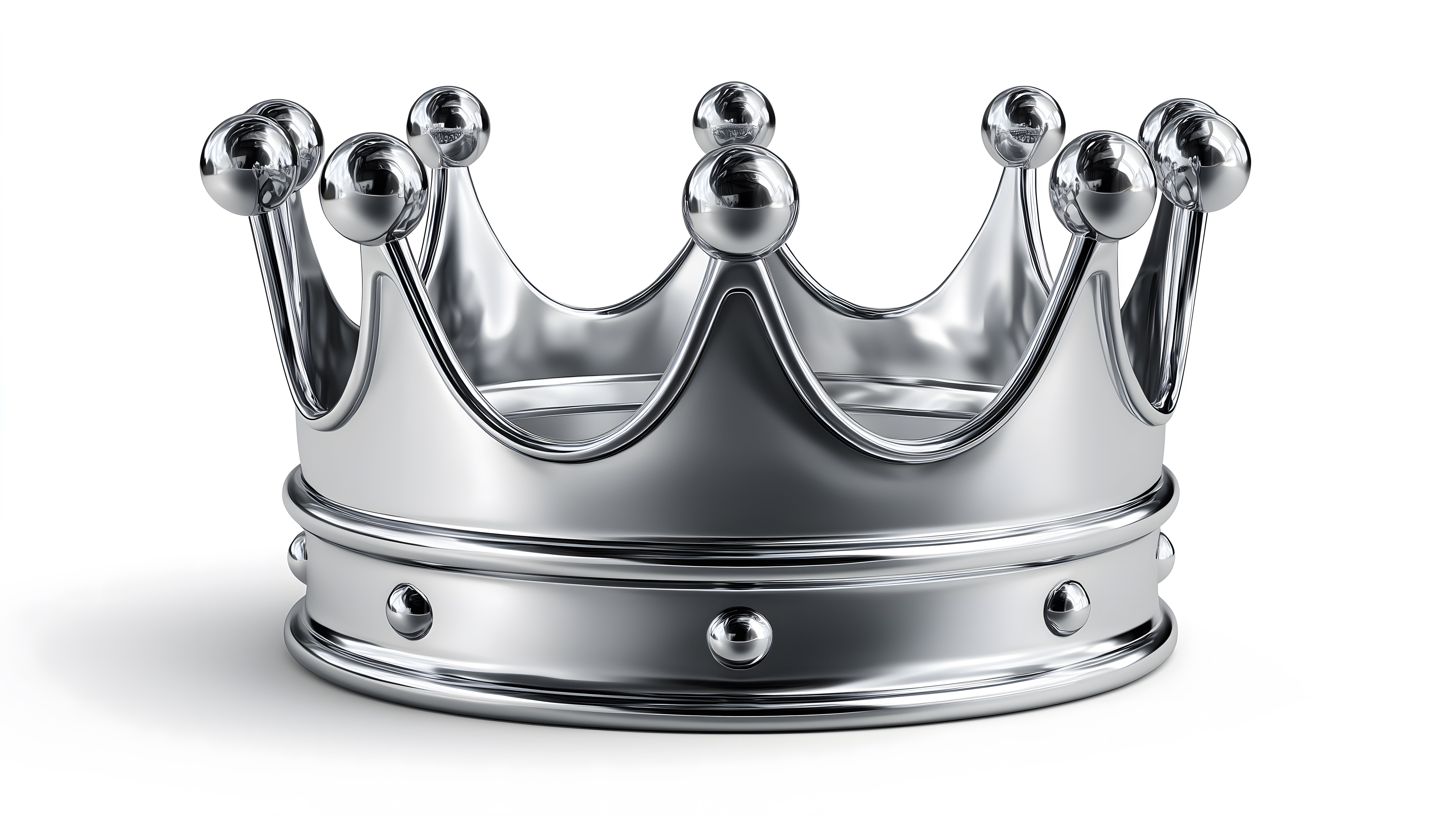 Das Bild zeigt eine prachtvolle, silberne Königskrone vor einem weißen Hintergrund. Die Krone ist detailliert modelliert mit mehreren Zacken und glänzenden Kugeln, die einen majestätischen Eindruck vermitteln. Durch die Anordnung der Krone im Zentrum des Bildes und den monochromen Farbstil wird die Aufmerksamkeit auf das Objekt selbst gelenkt, das wie ein Schaustück präsentiert wird.