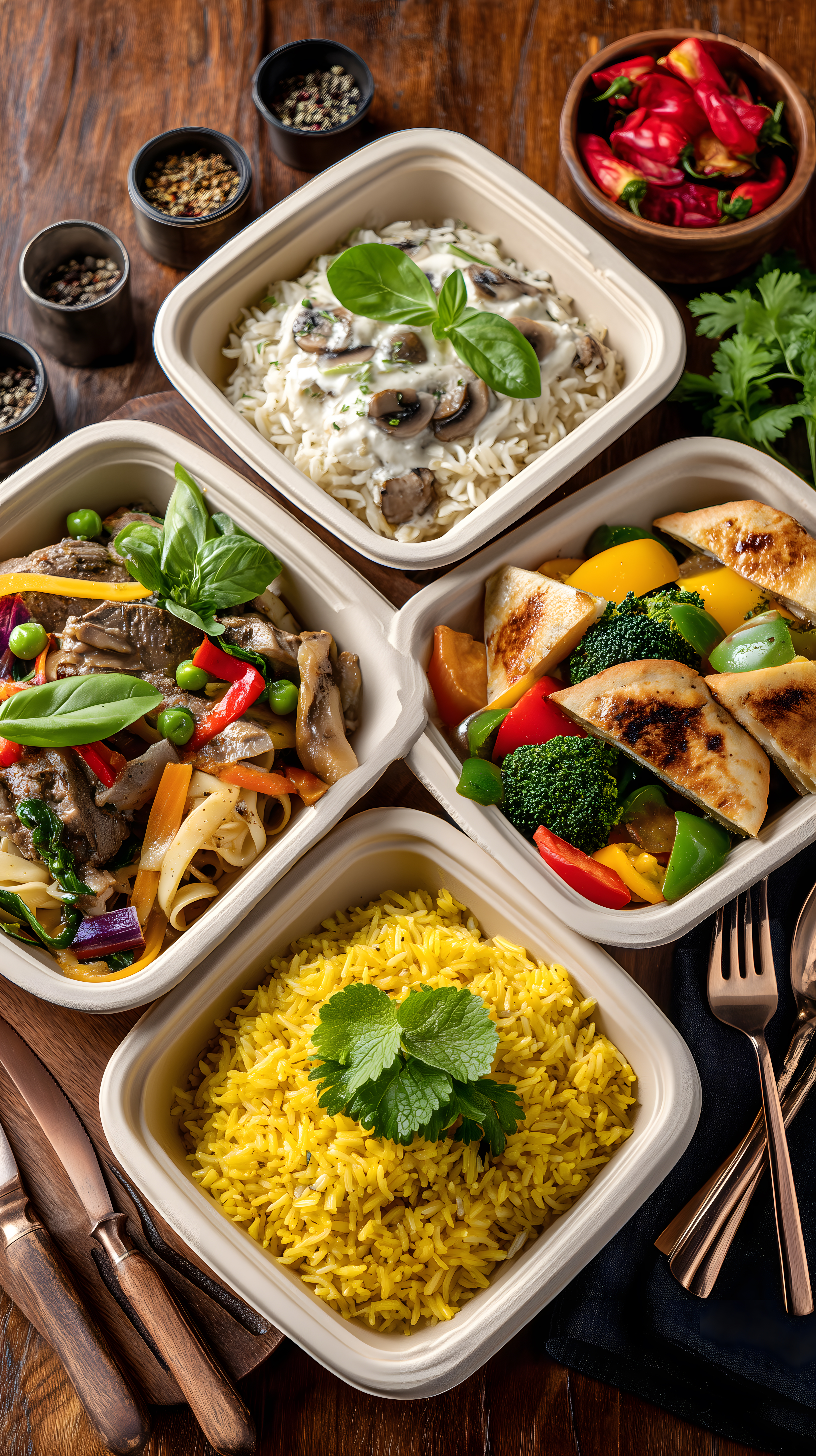 Dieses Foto zeigt mehrere leckere, gesunde Essensboxen auf einem rustikalen Holztisch. Die Boxen enthalten eine abwechslungsreiche Auswahl an frischen Zutaten wie Reis, Gemüse, Pilze und Kräuter. Die Anordnung der Boxen und die Verwendung unterschiedlicher Farben und Texturen machen das Bild sehr appetitlich und einladend. Diese hochwertige Fotografie eignet sich hervorragend als kostenloses Stockfoto für Blog-Beiträge, Newsletter oder Social-Media-Posts rund um das Thema gesunde Ernährung, Mahlzeitenplanung und Meal-Prep. Die hohe Auflösung und Creative-Commons-Lizenz bieten zusätzliche Flexibilität bei der Verwendung des Bildes.