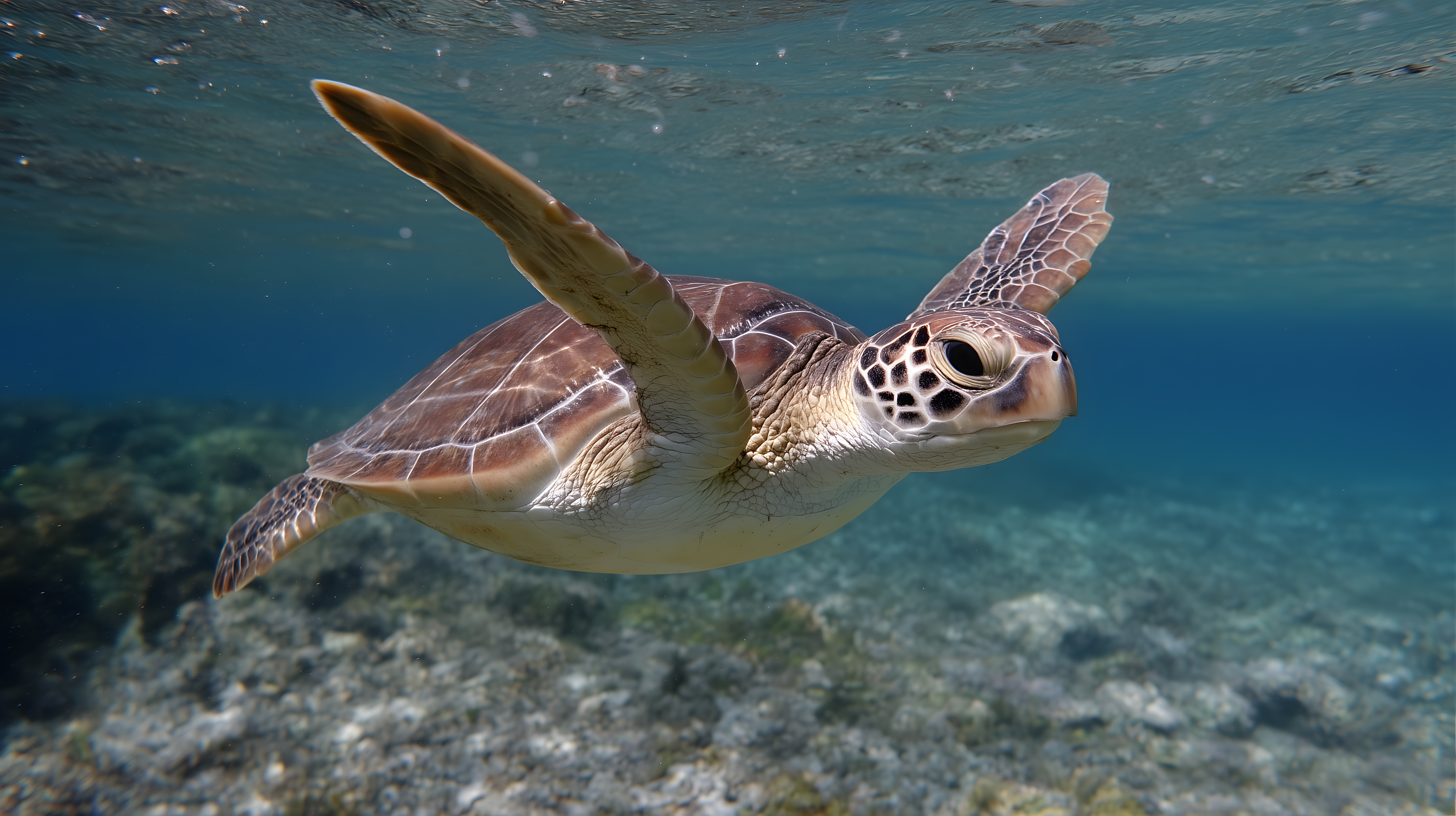 Das Foto zeigt eine Meeresschildkröte, die in einem klaren, tropischen Gewässer schwimmt. Die Schildkröte ist in einer natürlichen, entspannten Position dargestellt, mit ihren ausgestreckten Flossen und dem charakteristischen Panzer. Das türkisfarbene Wasser, durchsetzt mit Sonnenlicht, verleiht der Szene eine friedliche und faszinierende Atmosphäre. Dieses Stockfoto eignet sich hervorragend für verschiedene Einsatzzwecke, wie z.B. Blogbeiträge über Meeresfauna, Naturfotos für Social-Media-Posts oder Werbekampagnen, die eine tropische, aquatische Stimmung vermitteln möchten. Die hohe Auflösung und Creative-Commons-Lizenz machen es zu einem wertvollen und vielseitig verwendbaren Bildmaterial.