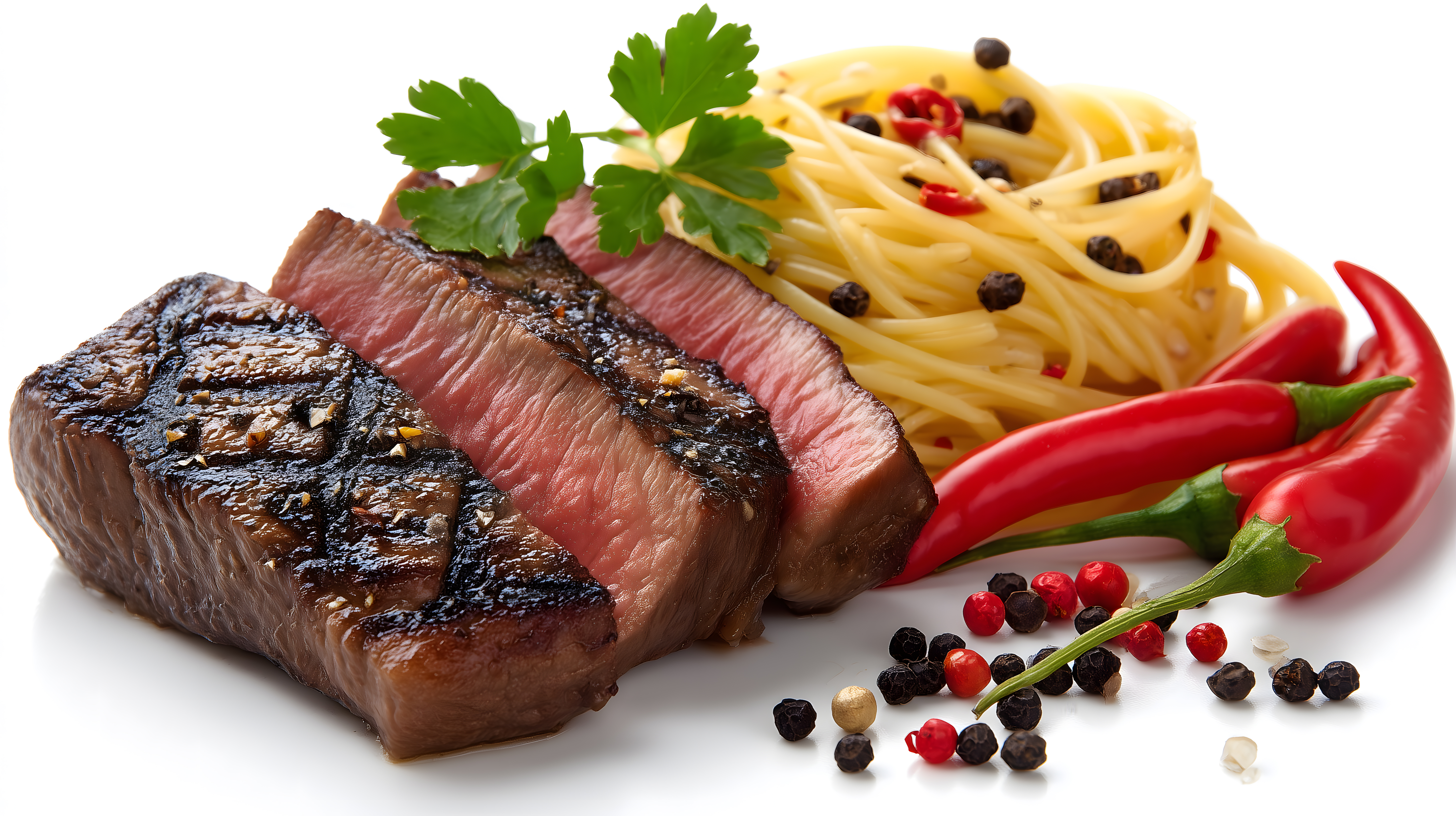 Das Bild zeigt ein leckeres Pasta-Gericht mit Linguine-Nudeln, einem Fleischstück und Chilischoten. Das Fleisch ist medium gebraten und hat eine schöne Kruste. Die Nudeln sind in einer körnigen Sauce serviert, die mit roten und schwarzen Pfefferkörnern angereichert ist. Als Dekoration dienen grüne Petersilienblätter. Das Gericht ist in einem warmen Farbspektrum aus Rottönen, Gelb und Grün gehalten und vermittelt einen appetitlichen, rustikalen Eindruck. Dieses hochauflösende und kostenlos nutzbare Stockfoto eignet sich hervorragend für Rezeptseiten, Food-Blogs, Newsletter oder Werbung rund um das Thema Kochen und gesunde Ernährung.