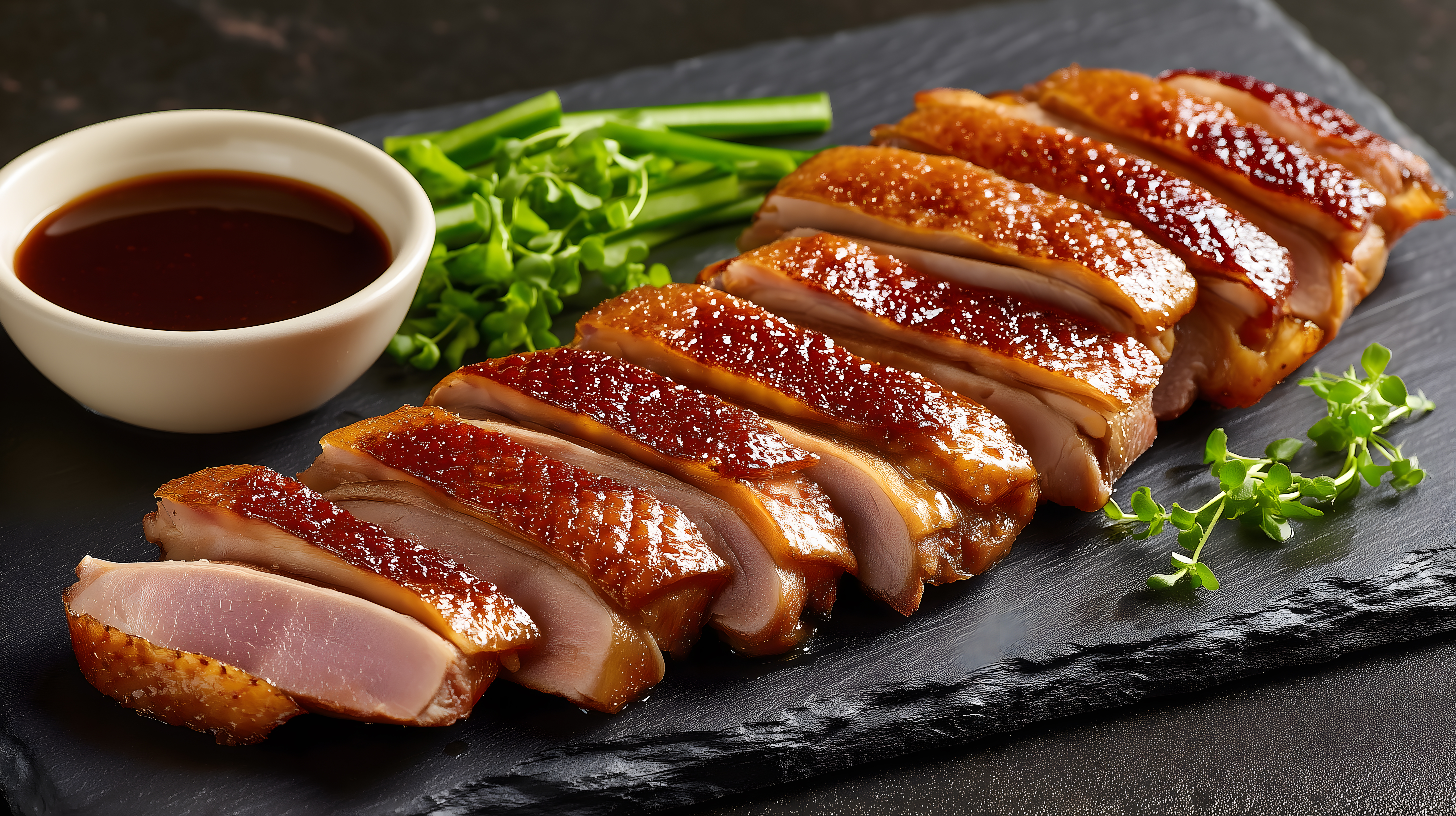 Dieses Foto zeigt eine Platte mit leckerer, geschmorrter Entenbrust. Die Ente ist in mundgerechte Scheiben geschnitten und mit einer glänzenden, karamellisierten Soße überzogen. Umgeben ist das Fleisch von frischen Frühlingszwiebeln, die dem Gericht einen erfrischenden, aromatischen Akzent verleihen. Die dunkle, schiefergraue Servierfläche bietet einen edlen, stilsicheren Hintergrund, der die Farben und Texturen der Speise perfekt in Szene setzt. Dieses Foto eignet sich ideal als hochwertiges Stockbild für Rezeptsammlungen, Foodblogs, Kochbücher oder Werbematerial im Gastronomie- und Feinkostbereich. Mit seiner stimmungsvollen Präsentation und appetitanregenden Optik wird es Ihre Zielgruppe sicher begeistern.