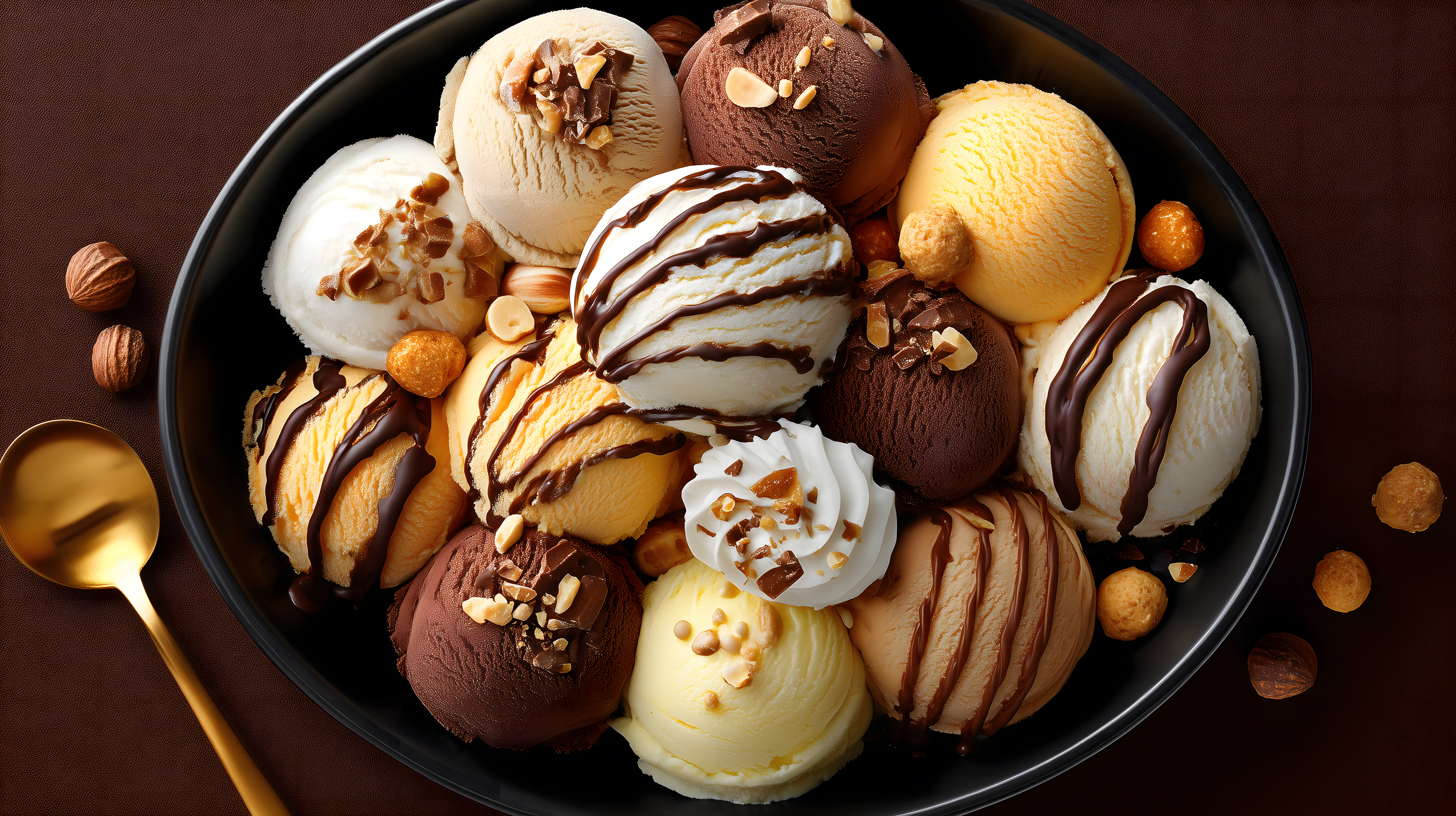 Dieses Foto zeigt eine verlockende Auswahl an verschiedenen Eissorten und Pralinen, die auf einem dunklen Hintergrund angeordnet sind. Die Eiscremes in unterschiedlichen Braun- und Gelbtönen sind mit Schokolade, Nüssen und Sahne dekoriert, was den Eindruck von Genuss und Verführung erweckt. Die Anordnung der Leckereien in der Schale verleiht dem Bild eine appetitliche und einladende Optik. Dieses hochauflösende Stockfoto eignet sich hervorragend für den Einsatz in Werbung, Blogbeiträgen oder Social-Media-Kanälen, um Süßwaren und Desserts in einer stimmungsvollen Umgebung zu präsentieren. Die Veröffentlichung unter einer Creative-Commons-Lizenz ermöglicht eine vielseitige Nutzung des kostenlosen Bildmaterials.