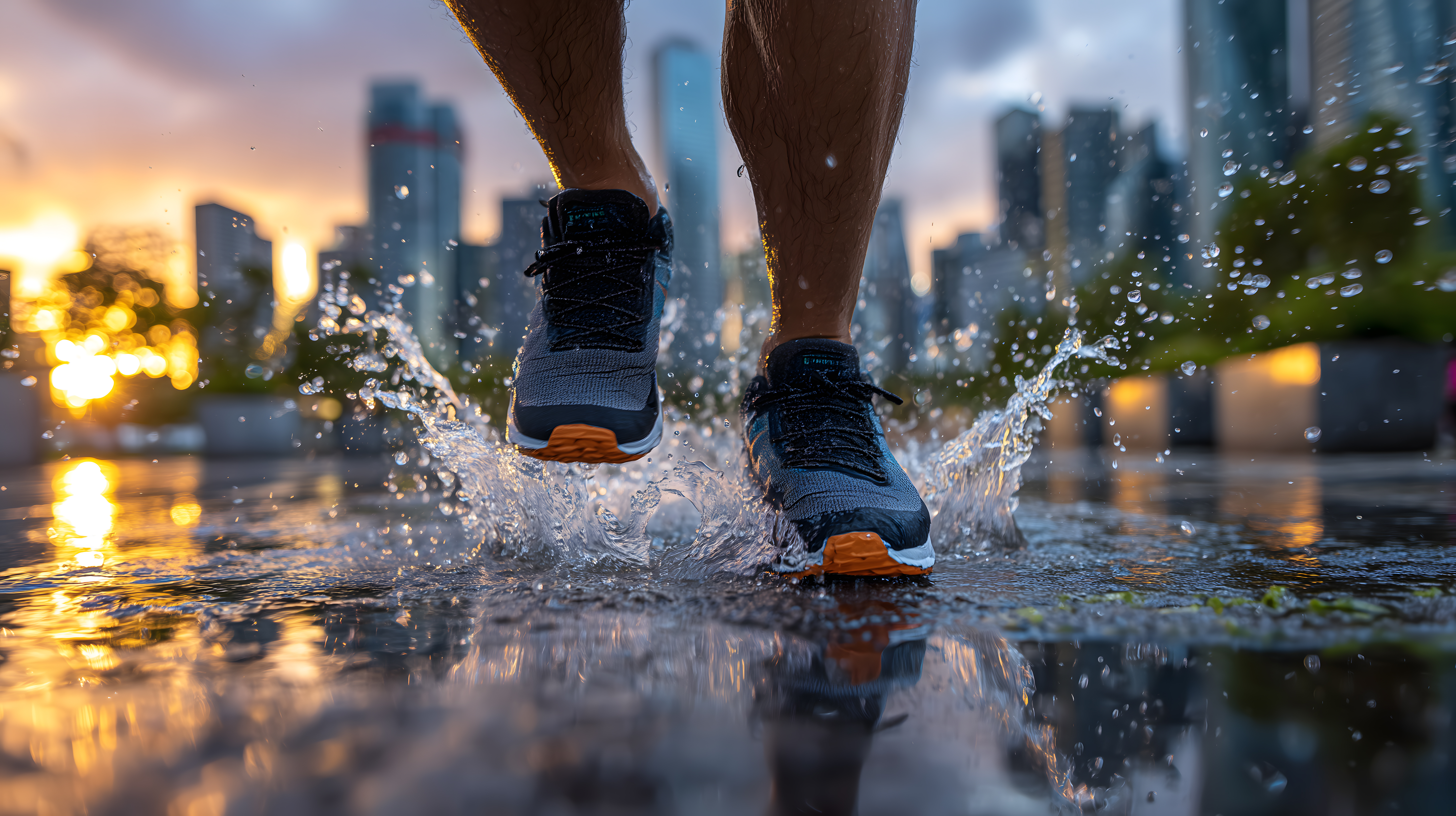 Dieses eindrucksvolle Stockfoto zeigt einen Läufer, der durch eine Pfütze in einer städtischen Umgebung bei Sonnenuntergang sprintet. Die verschwommenen Konturen des Sportlers lassen die Dynamik und Energie der Bewegung spürbar werden. Im Hintergrund ist die Skyline der Stadt mit ihren beleuchteten Wolkenkratzern zu sehen, deren Reflexion sich in der Pfütze widerspiegelt. Das farbenfrohe Licht des Abendhimmels verleiht der Szene eine stimmungsvolle Atmosphäre. Dieses kostenlose Stockfoto in hoher Auflösung eignet sich hervorragend für die Verwendung in Blogbeiträgen, Newslettern, Social-Media-Posts oder Werbematerialien rund um die Themen Sport, Fitness, Freizeit und gesunder Lebensstil. Es steht unter einer Creative-Commons-Lizenz zur Verfügung.